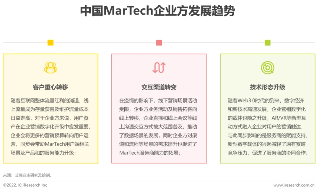 中国当前的营销数字化程度还处于前期加速阶段,随着流量成本的上升以及疫情的影响,私域场景营销的价值愈发凸显,企业方在MarTech场景中的广告营销预算投放将逐渐偏向用户运维,通过营销技术赋能,培养用户黏性与活跃度。同时,线上渠道技术的不断完善及元宇宙概念的兴起,使得企业在疫情期形成了对用户以及客户的线上触达习惯,有效促进了交互渠道的转变,丰富了MarTech场景下的技术形态及服务方向。