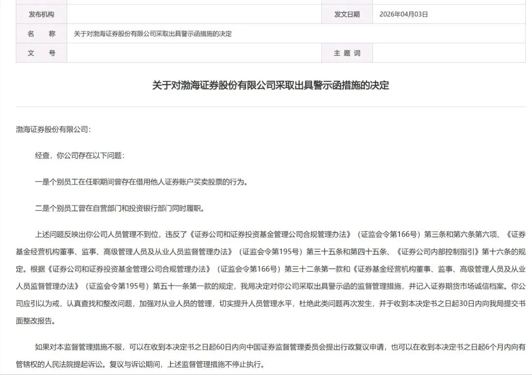 近日,两家券商接连收到监管警示函,引发市场关注。2026年4月3日,天津证监局对渤海证券股份有限公司采取出具警示函的监督管理措施,并将其记入证券期货市场诚信档案。仅在前一天,北京证监局也对东兴证券股份有限公司采取了出具警示函的行政监管措施。这两份处罚决定虽由不同地方证监局作出,但均直指证券公司内部管理与业务合规的核心问题。
