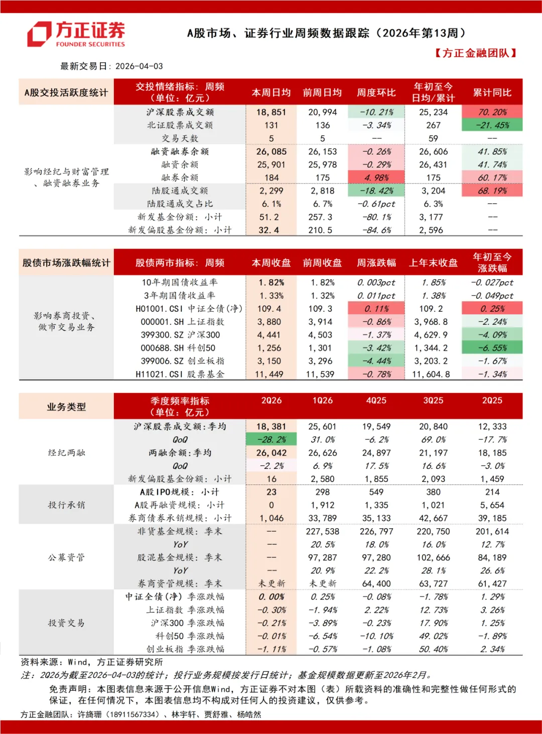 A股市场、证券行业周频数据跟踪(2026年第13周):