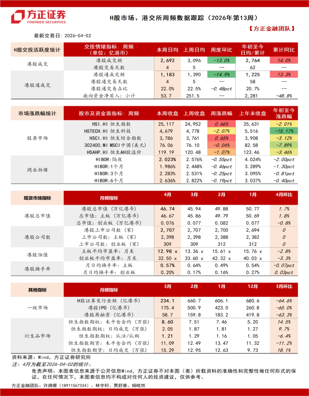 H股市场、港交所周频数据跟踪(2026年第13周):