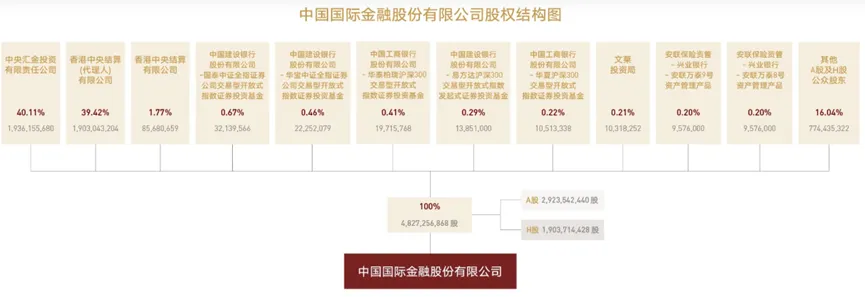 因为是我国第一家中外合资投行,所以很多人会下意识认为中金是合资券商,但又似乎通常都不把中金算到外资券商里面。于是带着困惑,笔者查了一下中金最新的股权结构,是下图这样子。