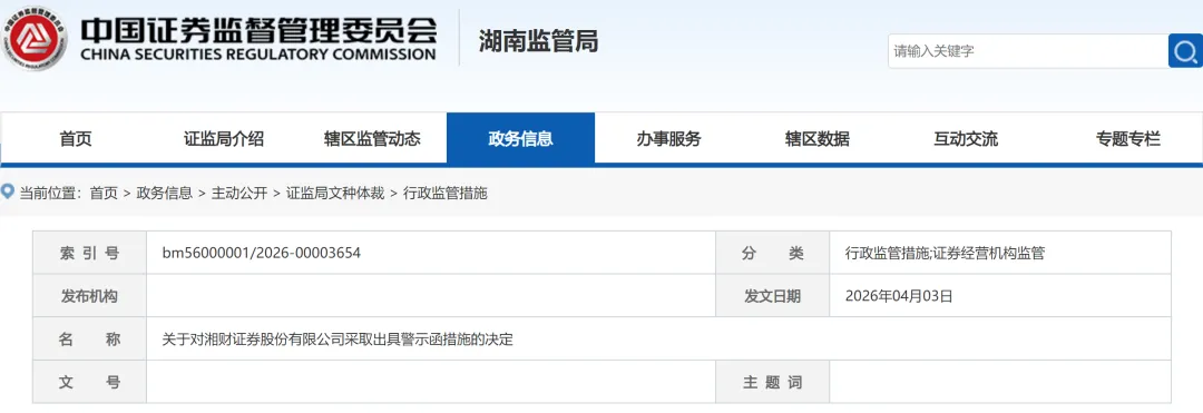 2026年4月初,三家券商收到地方证监局的行政监管措施。具体来看,北京证监局对东兴证券股份有限公司采取出具警示函的监督管理措施;湖南证监局与天津证监局分别对湘财证券股份有限公司与渤海证券股份有限公司采取出具警示函的监督管理措施,并将相关情况记入证券期货市场诚信档案。