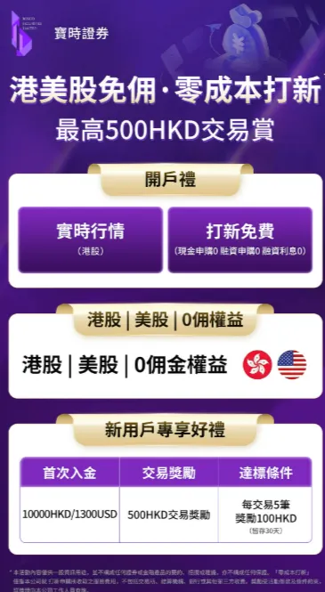 香港券商,入金一万带零头,留存30天,交易一笔即送400港币+一年免佣!开户简单,三分钟下号,无需任何资料!三、宝时证券(原凯敏证券):500港币+奖学金