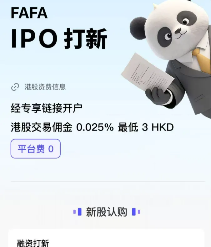 入金一万,留存30天,送500港币,每交易5次解锁一张100港币,再送90天港美股免佣!打新现金申购全免,融资手续费、利息全免,纯纯白嫖打新必开!开户简单,无需任何资料!四、熊猫证券:费率低