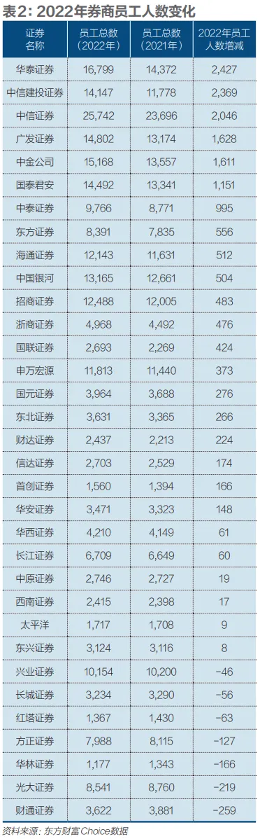 在中小券商中尤其值得关注的是中泰证券。数据显示,2022年,其员工人数增加了995人,紧跟头部券商之后。几乎所有业务条线都有人员增加。2022年报显示,中泰证券经纪业务人员增加了499人、投行人员增加173人、研究人员增加40人。