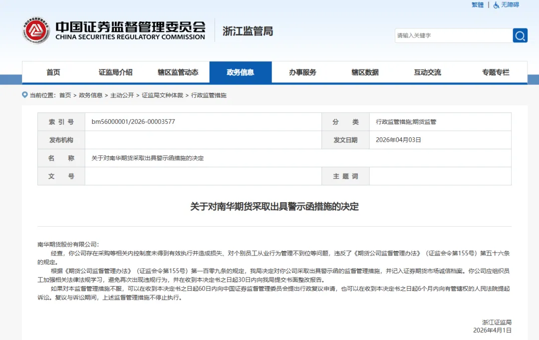 4月3日,浙江证监局对南华期货及公司总经理贾晓龙分别出具警示函,指出公司存在采购内控制度执行失效、员工从业行为管理不到位等违规情形。