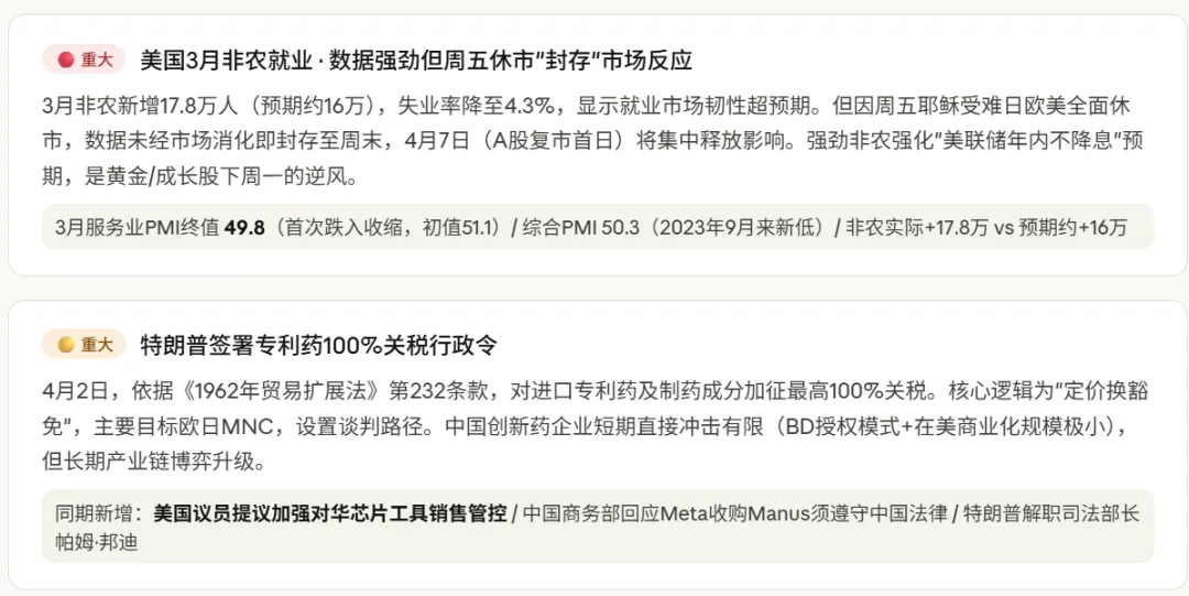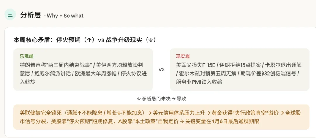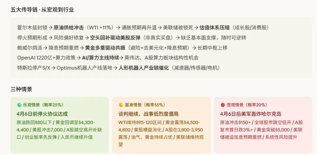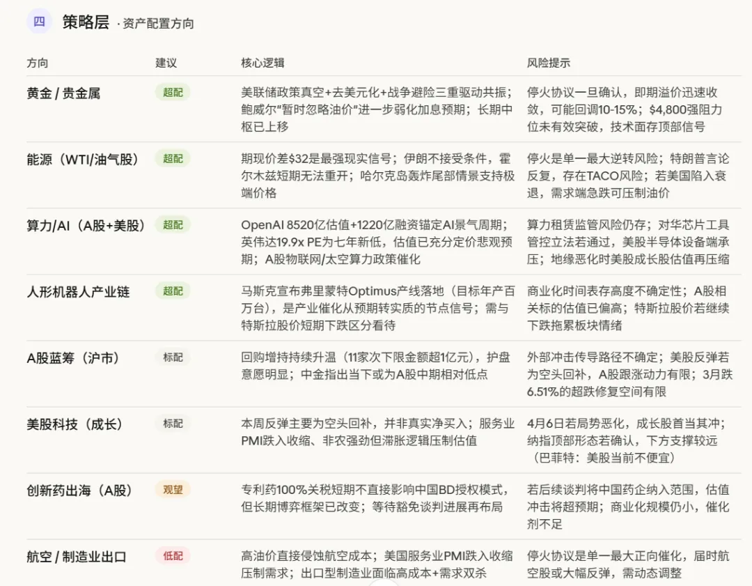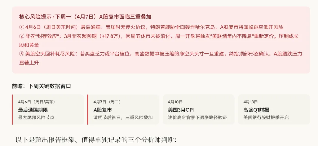 关于下周一A股复市的操作建议:综合三重风险叠加(最后通牒+非农封存效应+空头回补耗尽),复市首日存在跳空低开风险。核心观察指标按顺序是:① 4月6日美东时间是否有停火协议消息;② 周一油价开盘方向(WTI是否突破$115关口);③ 美股期货开盘方向(纳指期货若低开超1%则需防御)。若无停火,建议持仓以能源/黄金/算力为核心,规避航空、消费出口、创业板高估值标的。