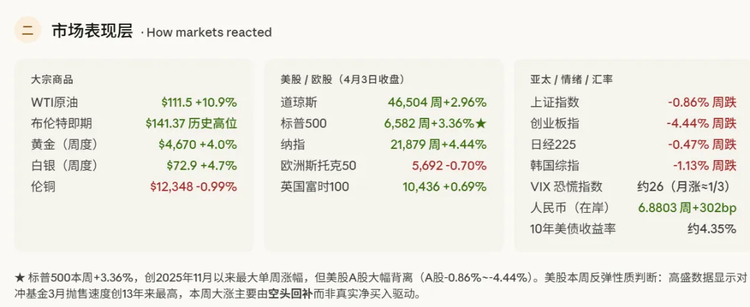 关于本周核心矛盾的精准定性:本周市场最大的错觉是"停火预期推动美股大涨"。但解剖本质,对冲基金在3月抛售全球股票的速度创十三年新高,此次抛售主要由空头抛售增加推动——这意味着本周标普+3.36%的反弹,很大程度是此前极度拥挤的空头被迫回补,而非真实买盘涌入。这与3月第一周WTI+35%时的"真实恐慌抛售"在性质上截然不同。空头回补式反弹最大的特征是:一旦触发新的负面事件(如4月6日最后通牒),做空资金可以迅速重建头寸,没有任何"买盘吸收"作为缓冲,跌速往往快于涨速。
