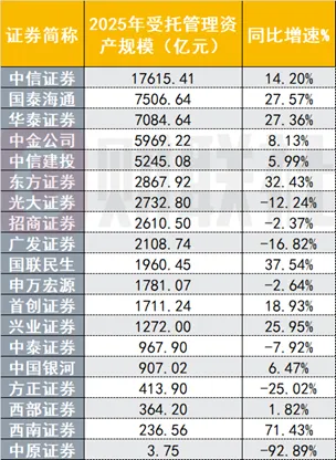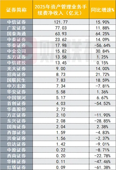 26家券商资管业务大比拼,2025年收入增速最高达64%,管理规模底部企稳随着上市券商2025年年报的陆续披露,券商资产管理行业的经营情况初见端倪。从目前已公布的数据来看,券商资管业务收入呈现显著马太效应,头部券商的资管收入普遍呈正增长,2025年收入增速最高达64%,而中小券商的资管业务收入多数下滑。在受托管理规模方面,行业呈现底部企稳态势。产品布局方面,目前券商资管重要的产品布局方向包括FOF、ABS、跨境投资等,获取公募牌照已非发展的唯一路径。26家券商资管手续费净收入合计409.01亿,增幅8.09%,结构上呈“强者恒强”格局目前,已有26家券商披露了2025年资产管理业务的收入,全年共实现资产管理业务手续费净收入409.01亿元,在可比口径下增长了8.09%。其中,13家券商实现2025年资管业务收入正增长。图:上市券商2025年资管业务收入(资料来源:Wind数据,财联社整理,其中华泰证券数据为母公司口径,不含其资管子公司)中信证券是唯一一家资管业务收入突破100亿元的券商,2025年实现121.77亿元,同比增长15.90%。中信证券在年报中表示,资产管理业务及中信证券资管2025年持续升级投资管理体系,推进投研专业化、体系化和精细化建设实现更高水平。私募资管业务深入推进策略产品分层管理体系,发展高质量产品线,打造清晰稳定的品牌产品系列,夯实“客群×区域”的矩阵式客户营销网络,扩大客户服务广度、提升服务深度。有8家券商的资管业务手续费净收入增幅超过10%,其中国泰海通受益于整合红利释放,资管业务增长显著,增幅达到64%。国泰海通年报指出,资管业务主动融入集团发展全局,充分发挥券商资管特色优势,推动 FOF 产品、公募量化产品以及企业理财规模实现快速增长。深化投研核心能力建设,不断完善产品矩阵,特色产品业绩表现良好。另外,服务国家“双碳”目标和民生保障,加大产品和服务模式创新,成功发行多单绿色及碳中和ABS产品。境外资产管理业务进一步丰富产品线,发力基金互认产品。招商证券的资管业务收入也增长了21.72%。年报表示,着力打造私募产品定制化服务能力,通过强化FOF产品及特色权益类产品的发行力度,进一步丰富定制产品种类。境外业务方面聚焦构建多元化产品体系,重点推进ETF产品发行,满足投资者跨境资产配置需求。从收入增幅的分布来看,券商资管业务的马太效应较为显著,“强者恒强”。在资管业务收入超过10亿的8家券商中,有7家实现增长;而资管收入低于5亿的12家券商中,10家均为负增长。华泰证券作为头部券商,母公司口径下,其2025年资管业务收入下降了56.64%,东吴证券非银金融行业分析师孙婷点对此点评称,收入下滑主要是出售Assetmark导致。从华泰证券资管子公司角度看,华泰证券资管2025年实现营收22.06亿,净利润11.42亿元,同比增加29.8%。增长原因在于,一方面,其投资资管业务重点推进固收 / 固收 +、权益、FOF、跨境业务等业务发展,管理规模有效提升 ;另一方面,其投行资管业务深度挖掘内外部资源,持续健全协同联动机制,积极锚定优质资产,不断提升定价能力,重点通过 ABS 业务和公募 REITs 业务夯实业务增量。中小券商中,西南证券、东兴证券、华林证券、首创证券、红塔证券等2025年资管业务收入降幅都超过20%。首创证券2025年资管收入同比下滑54.52%,年报表示,受债券市场行情影响,公司资管产品超额业绩报酬下降,业务收入有所回落。券商受托管理资产规模底部企稳在资产管理规模方面,有19家券商提供了2025年受托管理资产规模及可比数据,共计管理资产规模6.33万亿,同比增长约12%。另根据中证协最新发布的2025年券商经营情况分析报告,截至2025年末,券商资产管理受托资产总净值达10.21万亿元,同比增长5.49%;其中集合资管和专项资管成为增量主力,规模分别增长13.48%、14.49%。其中,集合资管业务规模占比(33.72%)首次超过单一资管业务规模占比(32.84%),产品结构持续优化;非固收类资管规模约3.60万亿元,同比增长16%,主动管理成效逐步显现。东吴证券非银金融行业分析师孙婷在相关研报中指出,随着资管新规过渡期结束,券商资产管理业务去通道化基本完成,受托管理资产规模底部企稳。图:上市券商2025年末资产管理规模(资料来源:Wind数据,财联社整理)具体从结构上来看,国泰海通、华泰证券、东方证券、国联民生、兴业证券等2025年受托管理资产规模增长较快,增速均在30%左右。国联民生证券同样受益于整合,2025年受托资产管理规模同比增长37.54%。公司年报表示,致力交付投资确定性,深化投研专业化与精细化建设,打造特色产品谱系,实现固收、权益、多元配置及ABS业务的协同发展。依托数智化平台建设,公司全面提升主动管理能力和综合服务效能,推动资产管理规模实现稳健增长,成功跻身中型资管机构行列。中小券商中,西南证券2025年受托管理的资产规模增长超过70%。公司年报表示,资产管理积极推动业务布局优化与合作生态拓展,管理规模实现快速增长。私募资管业务坚持客户导向,加强投研能力建设,积极推进多元化产品布局,推出纯债、固收+、权益、FOF等差异化策略产品,有效匹配不同风险偏好客户需求。在近年券商资管向主动化管理转型的过程中,多元布局、产品创新一直是行业的主流趋势。从上述券商的年报披露来看,券商资管产品重要的布局方向包括FOF、ABS、跨境投资、以及响应国家战略的