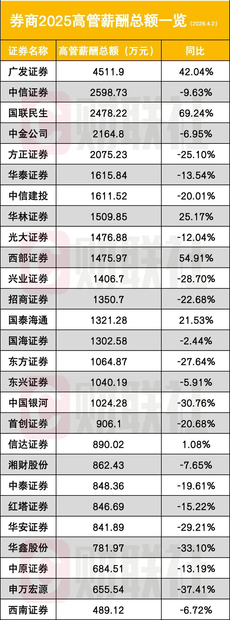 员工端表现尤为亮眼:25 家券商 2025 年员工人均薪酬实现增长,占比高达 92.59%,行业薪酬随业绩回暖全面修复。与之形成对比的是,21 家券商高管薪酬总额同比下降,占比达 77.78%;27 家券商高管年薪总额合计 3.78 亿元,同比下降 6.03%。