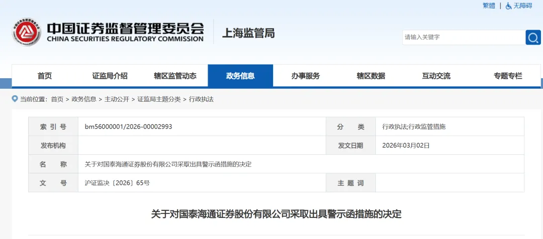 对公司:上海证监局给国泰海通证券出具了警示函(相当于一个正式的官方警告)。