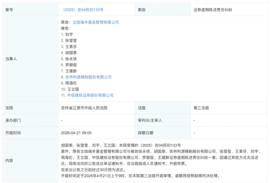 近日,企查查披露了一起开庭公告,北信瑞丰基金管理有限公司(下称“北信瑞丰”,现更名为“华银基金”)向辽源市中院提起诉讼,将中信建投(601066)、利源股份(002501)等多方告上法庭,案由为证券虚假陈述责任纠纷,将于2026年4月21日开庭。