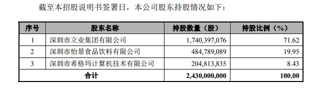 目前,华林证券只有三位股东,分别是深圳市立业集团有限公司、深圳市怡景食品饮料有限公司、深圳市希格玛计算机技术有限公司,持股比例分别是71.62%、19.95%、8.43%,总股本24.3亿股。