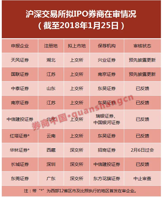 截至2018年1月25日,证监会公布的拟上市券商共有8家,正常审核状态下的有7家,还有1家东莞证券“中止审查”有待恢复。