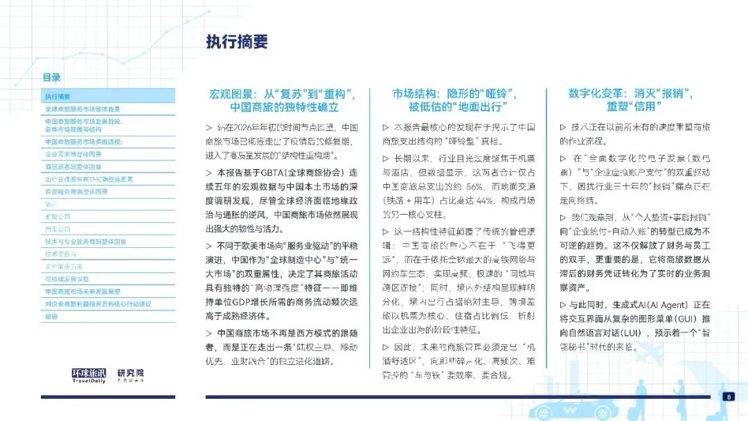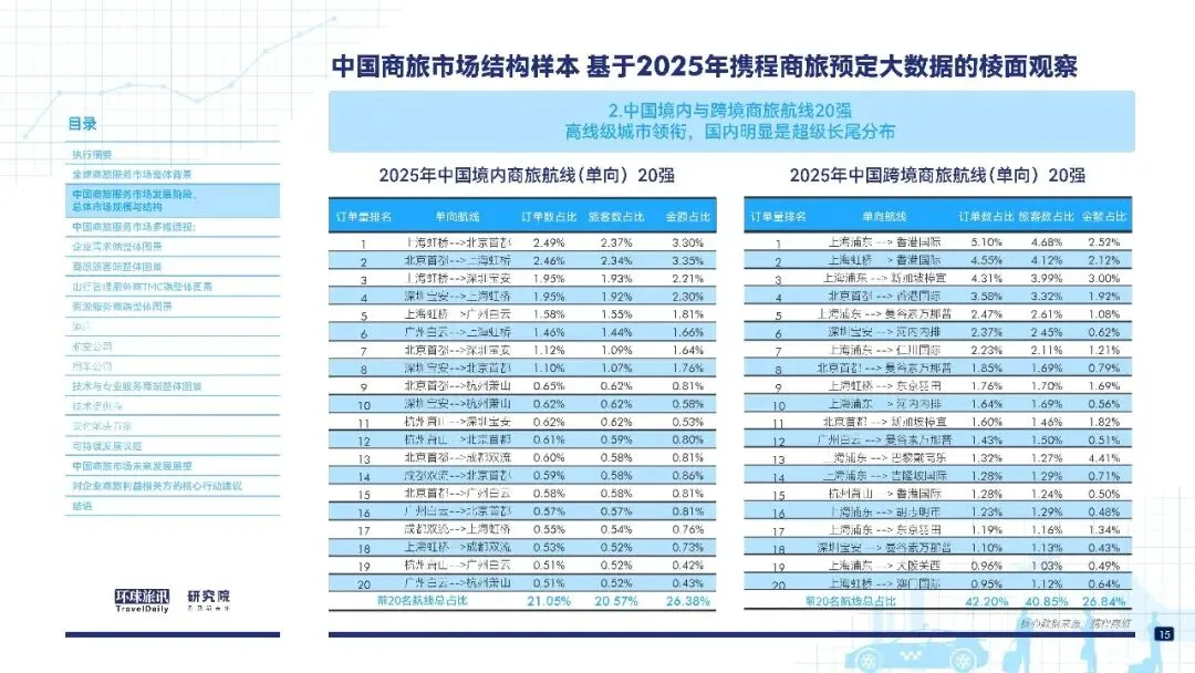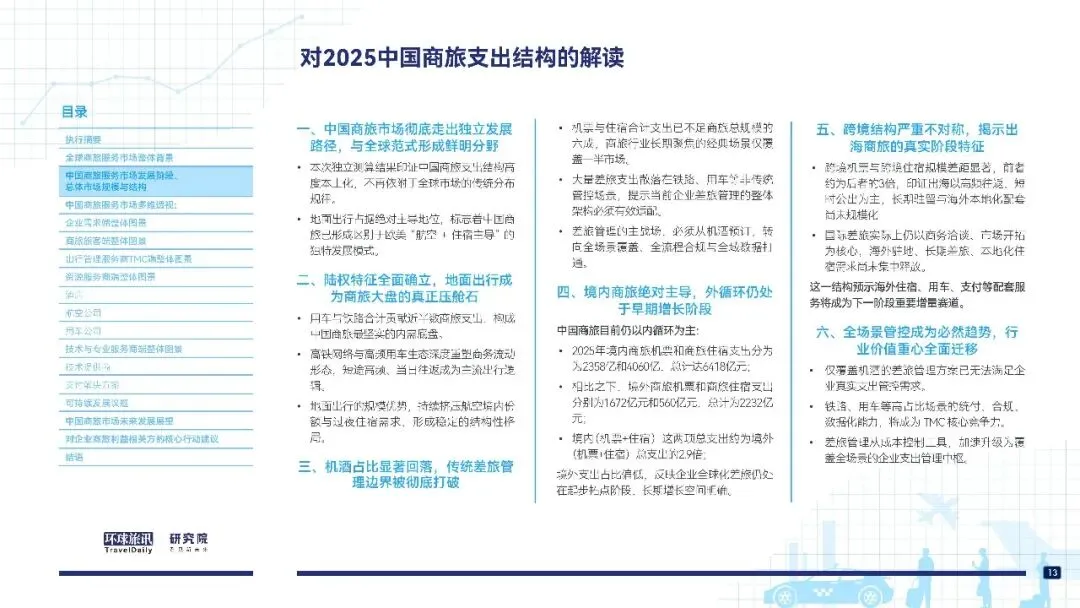 这份2026 版中国商旅市场研究报告(环球旅讯 × 携程商旅)核心结论可概括为:中国商旅市场已进入高质量结构性重构期,走出陆权主导、移动优先、业财融合的独立发展道路,呈现 “哑铃型” 支出结构,数字化与生态重构成为核心趋势。