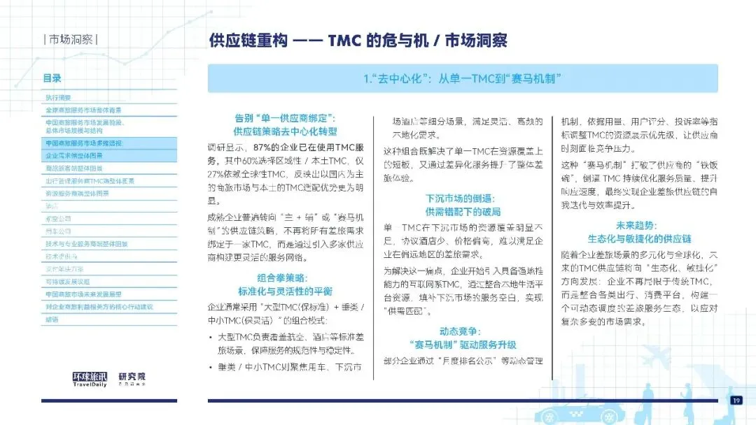 TMC:去垫资化、去佣金化,转向服务费 + 技术费模式,面临价格倒挂、信任危机,主流采用 “主 + 辅” 供应链与赛马机制。