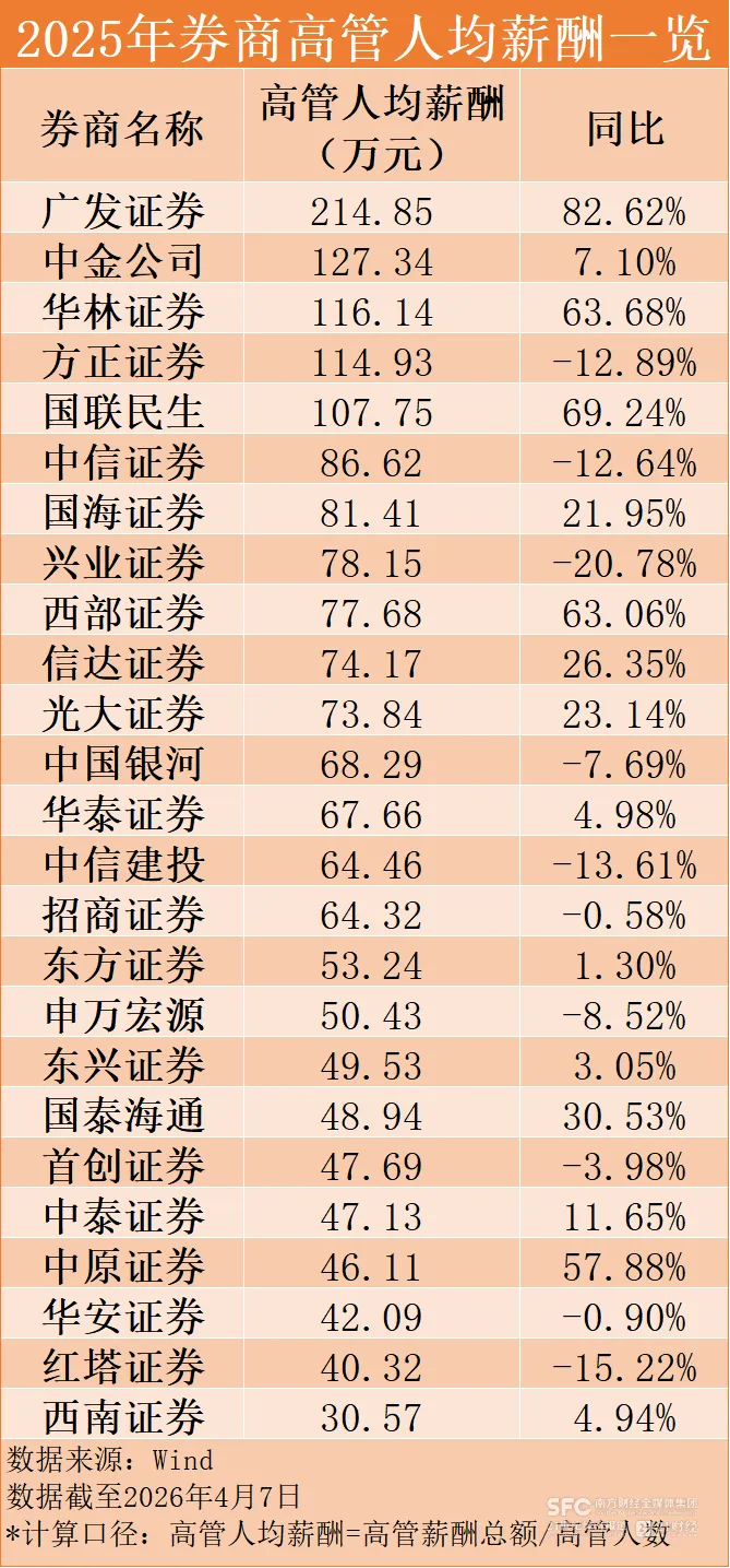 25家可比券商中,有15家高管人均薪酬同比上涨,占比约六成。其中,广发证券2025年高管人均薪酬增幅高达82.62%,领跑全行业;国联民生、华林证券、西部证券、中原证券等也实现了超过50%的增长。