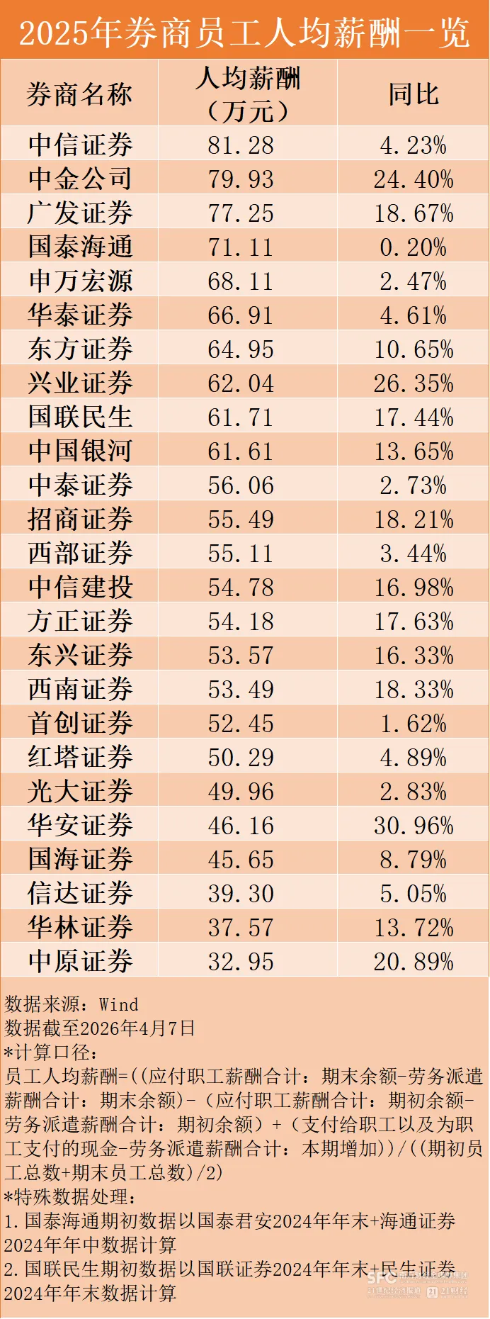员工层面,在行业业绩回暖的带动下,人均薪酬普遍上涨,上述25家可比券商全部实现正增长,中信证券以81.28万元的人均薪酬领跑。