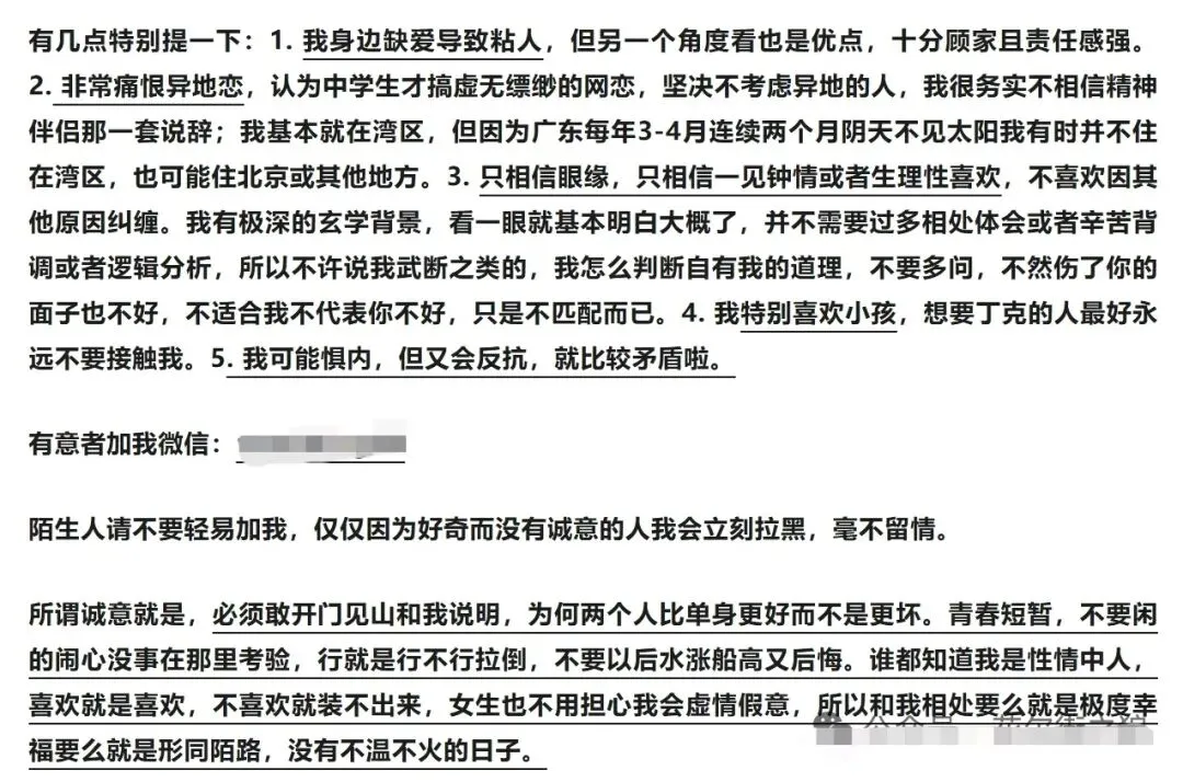 征婚条件中明确提出“能量对等”“价值匹配”的理念,将婚姻视为“人生战略合作伙伴”的长期合作,体现典型金融从业者思维。