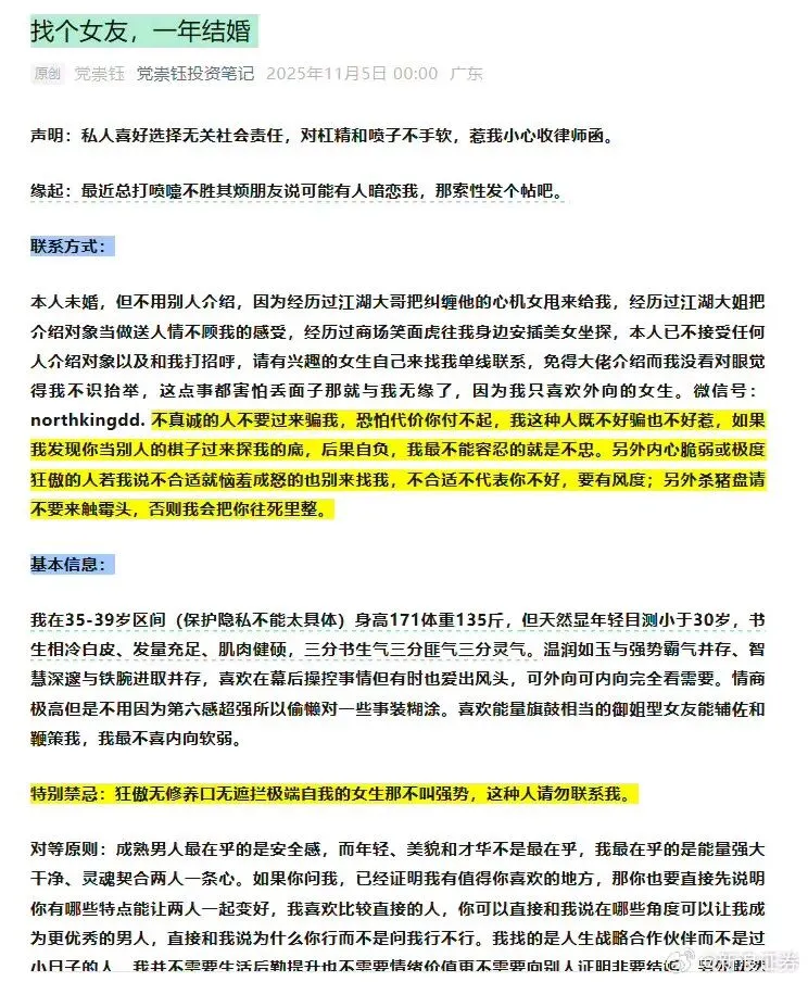 前券商首席党崇钰征婚引发热议:原国海证券海外策略首席分析师党崇钰于2025年11月发布题为《找个女友,一年结婚》的征婚帖,因措辞犀利、充满金融人特有的理性与风险意识而迅速走红。