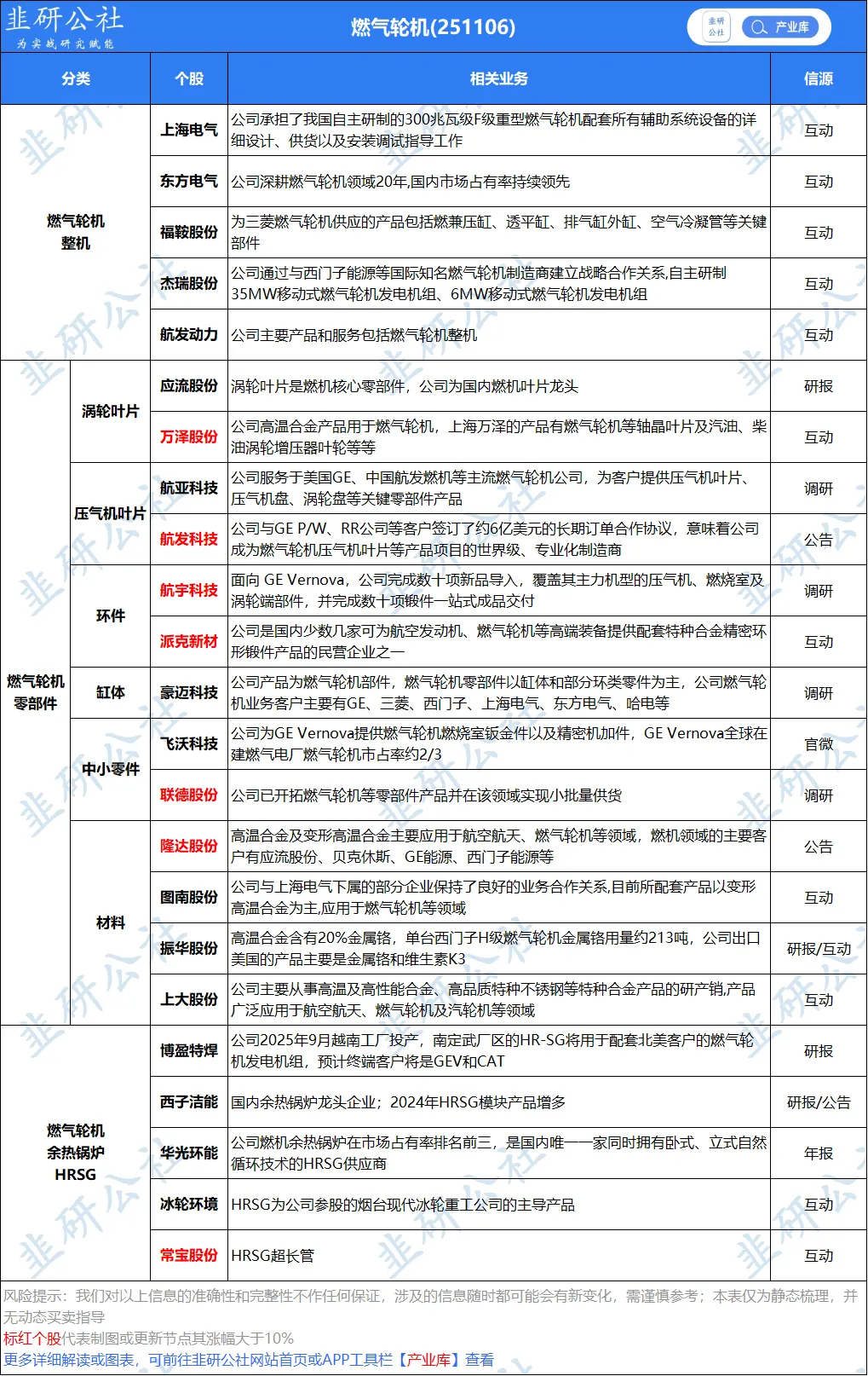 自研燃机--东方电气(自主燃机龙头)、汽轮科技(杭汽轮)、中国动力(发电一体化)、航发动力(航发燃机)、福鞍股份(中小燃机)等;