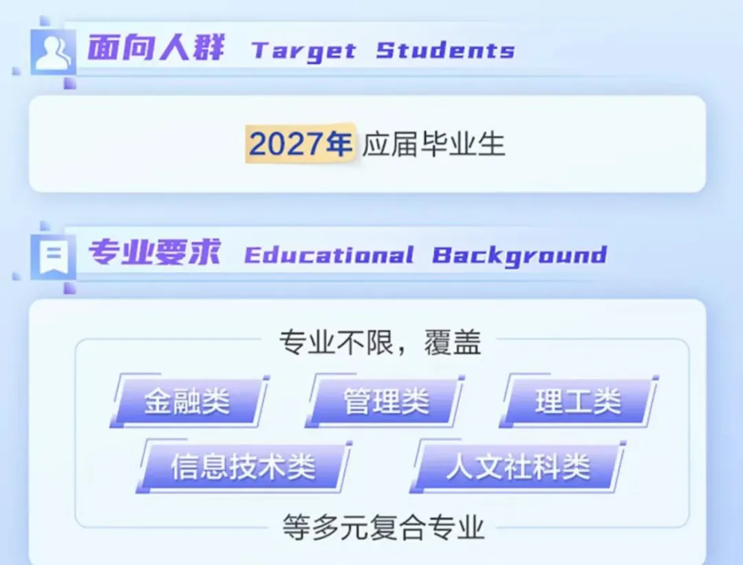 这次主要面向的是27届的毕业生,不限专业,咱们孩子要是有金融+理工科的复合专业背景,那么投递会更吃香。