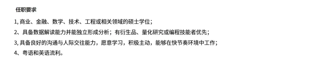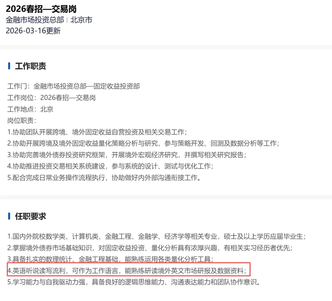 有的岗位还很偏爱咱们留学生,像交易岗,负责的是境外固定收益自营投资的交易工作,所以留学生流利的口语、对海外金融市场的了解,在这都能派得上用场。