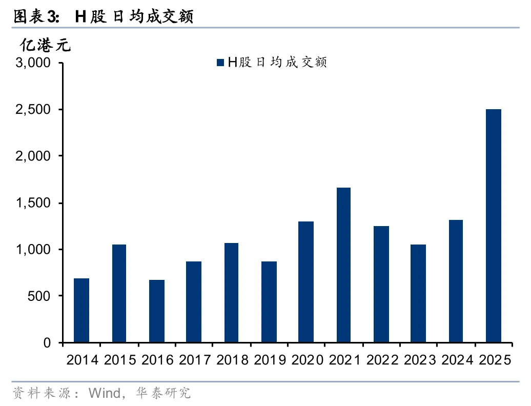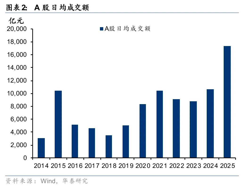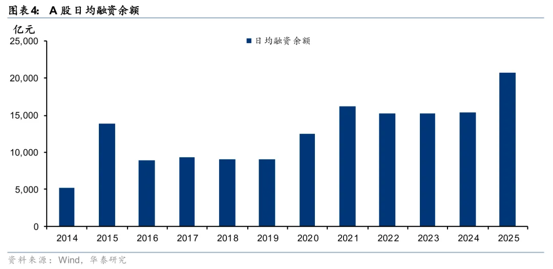 2025年核心宽基指数实现全年双位数涨幅,交易活跃度同比大幅提升。2025年A股、港股全年日均成交额分别为17278亿元和2497亿港元,同比+63%、+89%;A股日均融资余额20656亿元,同比+34%。核心宽基指数如上证、恒指、恒生科技全年均录得两位数涨幅,创业板指、科创综指全年涨幅超40%。