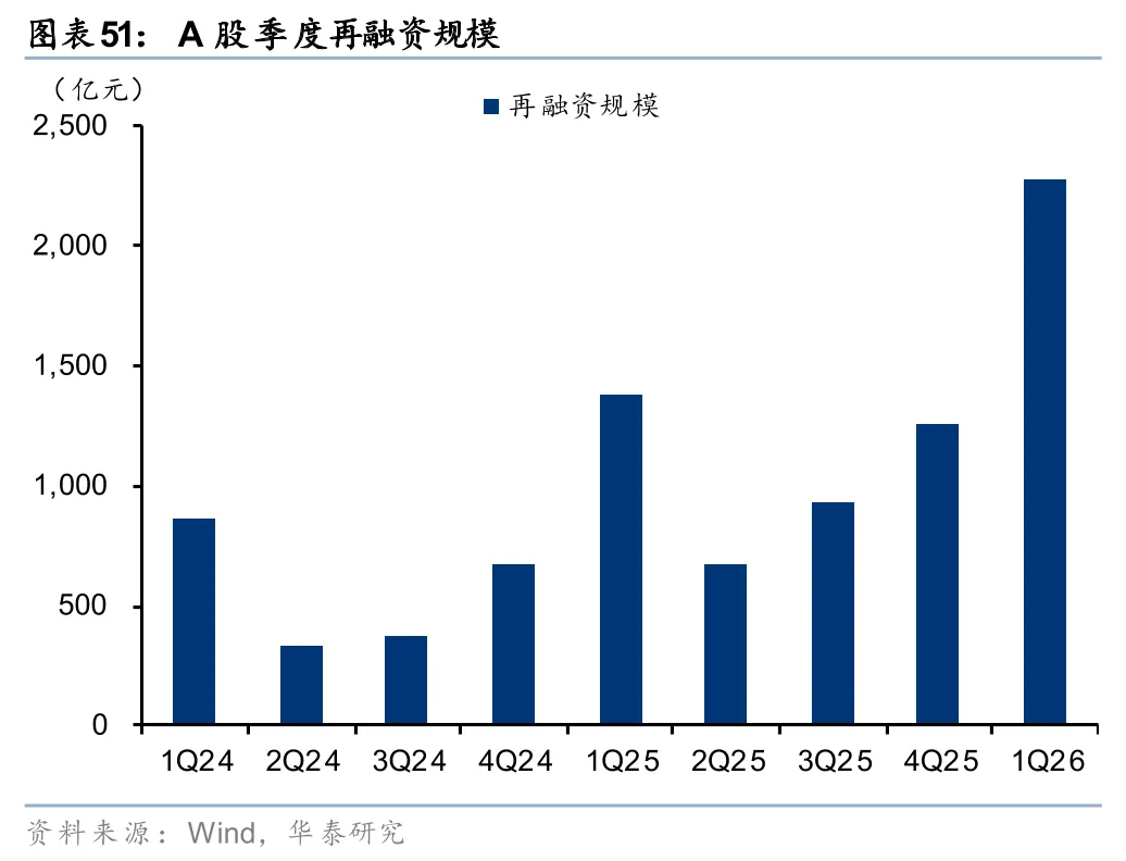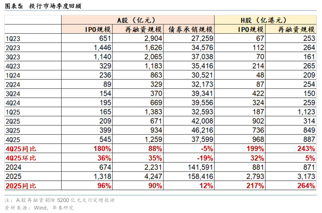 一级市场热度显著提升。2025年A股股权融资金额合计5565亿元(剔除5200亿元大行定增扰动),券商债券承销金额15.8万亿元,H股股权融资金额5966亿港元,同比分别+92%、+12%、+240%。