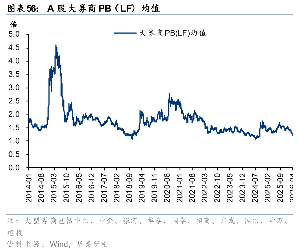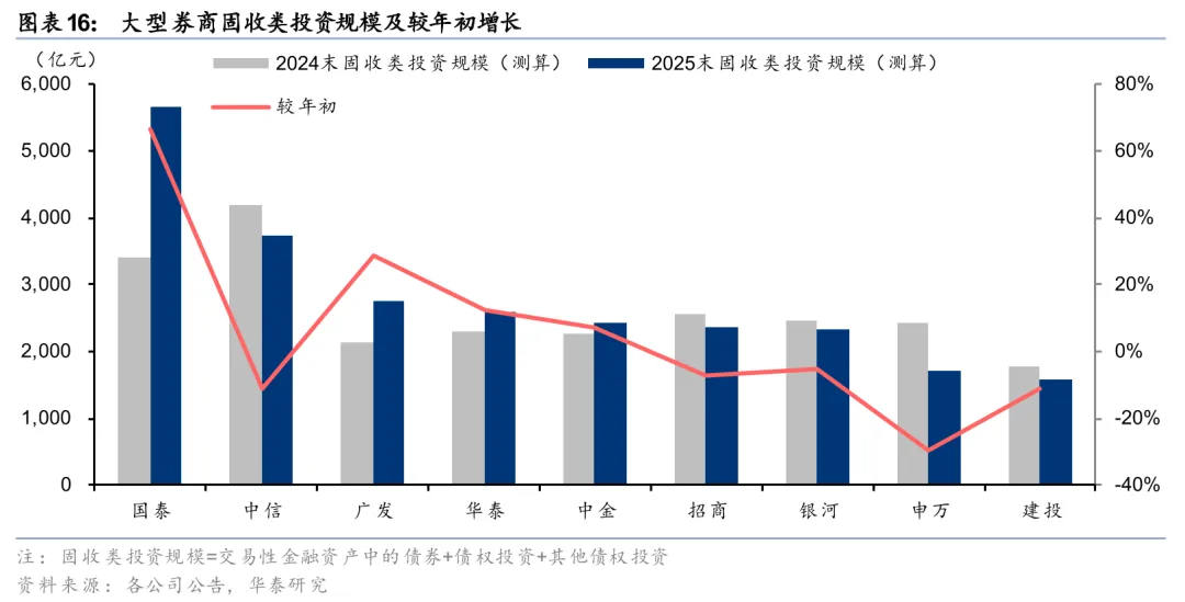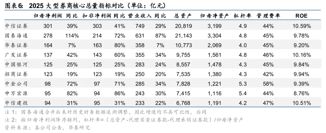 1)金融投资和客户资金驱动总资产显著扩张。2025年末大型券商总资产合计10.06万亿元,较年初+30%。从绝对规模看,国泰海通总资产规模达21,143亿元,跃居行业第一;中信总资产规模20,819亿元,较年初+22%,位居行业第二。二者成为行业内唯二总资产突破2万亿元的公司。从驱动因素看,大型券商内部不尽相同,但金融投资和客户资金贡献了核心增量。其中华泰、广发、中金主要由金融投资驱动,银河、申万主要由客户资金驱动,中信则相对均衡,金融投资和客户资金共同驱动扩张。从杠杆率(剔除保证金)看,华泰、广发提升较快,分别较年初提升0.76x、0.84x,期末为4.04x、4.79x。申万、招商杠杆率下滑,其中申万下滑较多,较年初下行0.12x至5.37x,但仍为大券商中最高。