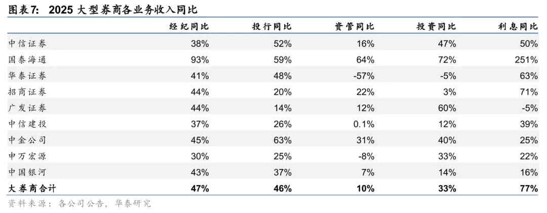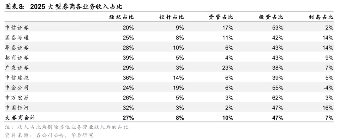 投资、经纪弹性延续,利息、投行显著修复,资管保持稳健增长。从业务结构看,2025年大型券商收入结构较均衡,投资和经纪为主要贡献,收入占比分别为47%和27%。从同比变化看,2025年大券商利息、经纪、投行、投资、资管分别同比+77%、+47%、+46%、+33%、+10%,其中投资、经纪贡献核心增量,利息、投行显著修复,资管保持稳健增长。