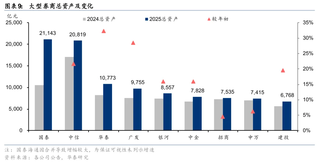 大券商总资产合计较年初+30%,国泰海通、中信超2万亿元。2025年末大型券商总资产合计10.06万亿元,较年初+30%。从绝对规模看,国泰海通总资产规模达21,143亿元,跃居行业第一;中信总资产规模20,819亿元,较年初+22%,位居行业第二。二者成为行业内唯二总资产突破2万亿元的公司。