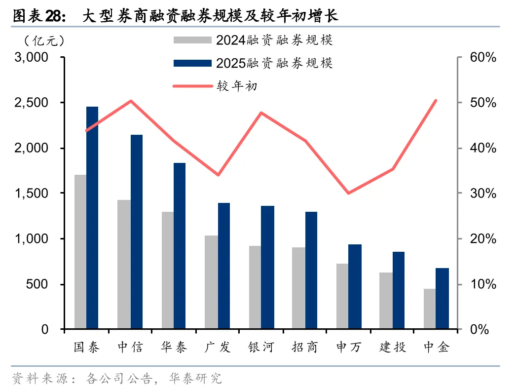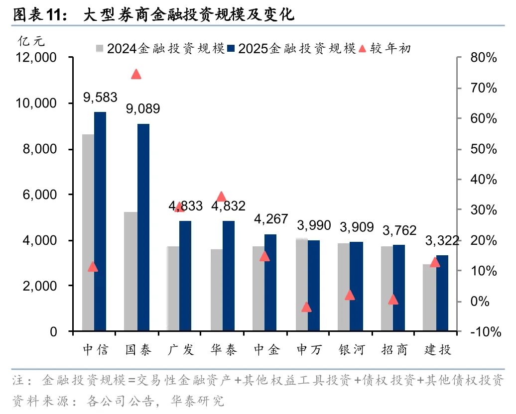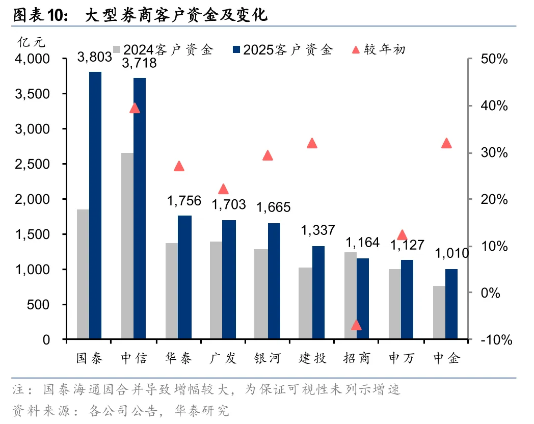 金融投资和客户资金共同驱动总资产显著扩张。从总资产增长的驱动因素看,大型券商内部不尽相同,但金融投资和客户资金贡献了核心增量。9家大券商中,8家实现金融投资规模增长(申万小幅下滑),8家实现客户资金规模增长(招商小幅下滑)。其中华泰、广发、中金主要由金融投资驱动,银河、申万主要由客户资金驱动,中信则相对均衡,金融投资和客户资金共同驱动扩张。