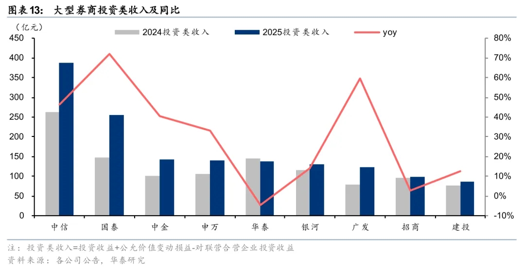 大券商全年投资类收入高增,合计同比+33%。2025年AH股核心宽基均实现上涨,上证指数+18.4%,创业板指和科创综指涨40%以上,恒生指数和恒生科技涨20%以上,债券市场虽有季度波动但整体偏稳,中债新综合指数全年上涨0.6%。从同比变化看,2025年大券商投资类收入合计同比+33%。其中广发、中信、中金投资类收入同比分别+60%、+47%、+40%,增长较多。从绝对收入规模看,中信实现投资类收入386亿元,保持稳定领先优势。