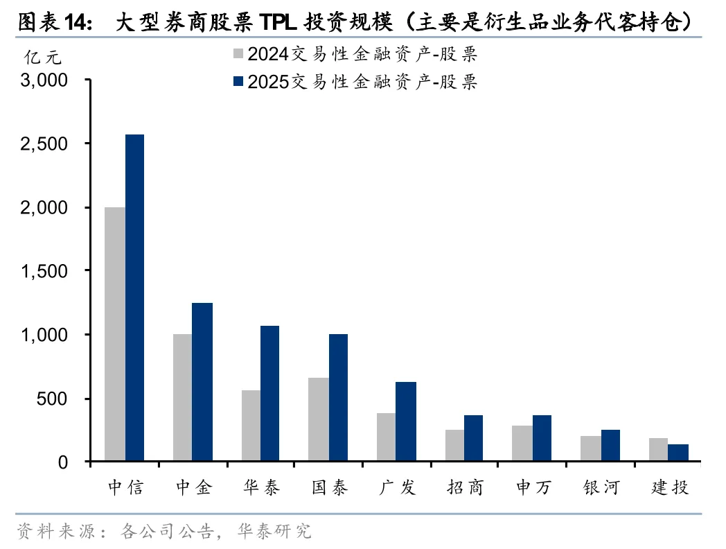 2)投资弹性延续,股票TPL和权益OCI普遍扩张。2025年大券商投资类收入合计同比+33%,弹性延续。投资结构看,股票TPL(以衍生品业务代客持仓为主)、权益OCI(含股票OCI和永续债等)、固收类(债券TPL+债权投资+其他债权投资)投资规模分别合计7,621亿元、4,836亿元、2.5万亿元,较年初+37%、+50%、+7%。权益OCI占比进一步提升,投资收益的稳定性增强。衍生品规模扩张,2025年末大券商衍生品名义本金合计较年初+24%,其中权益类衍生品名义本金合计较年初+20%。