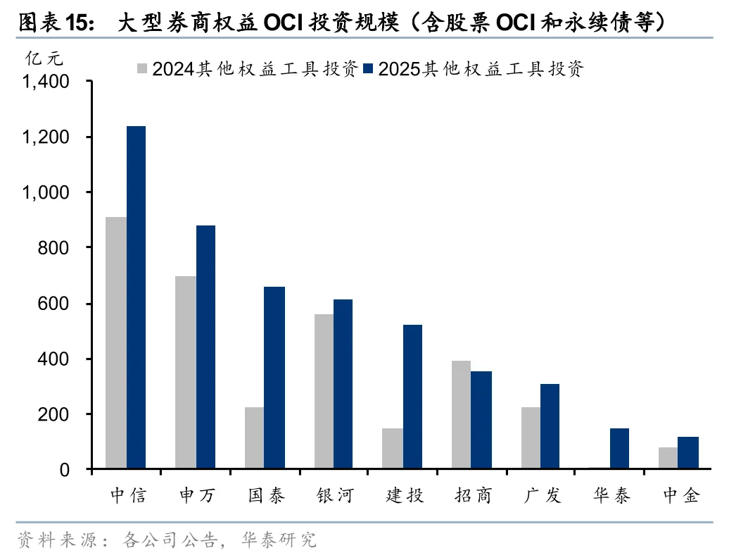 大券商股票TPL和权益OCI规模普遍提升。1)股票TPL(主要是衍生品业务代客持仓):大券商期末普遍较年初增长,且增幅较大,9家大券商中仅建投有所下滑。中信增长28%至2563亿元,是大券商中唯一超过2000亿元的。华泰、广发、招商增速领先,分别较年初+88%、+63%、+45%,但绝对规模与第一名仍有差距。2)权益OCI(含股票OCI和永续债等):除招商外,其他8家大券商的权益OCI规模均有提升,华泰、建投增速较高。中信以1237亿元的规模稳居第一位,同时保持较高增速,较年初+36%。大券商中,银河、广发、招商、建投、中金均披露了权益OCI结构,其中股票OCI规模分别为166/155/96/76/62亿元,较年初+21%/15%/114%/738%/18%。整体看,大券商权益OCI在金融投资中的比例普遍有所提升,投资收益的稳定性进一步增强。