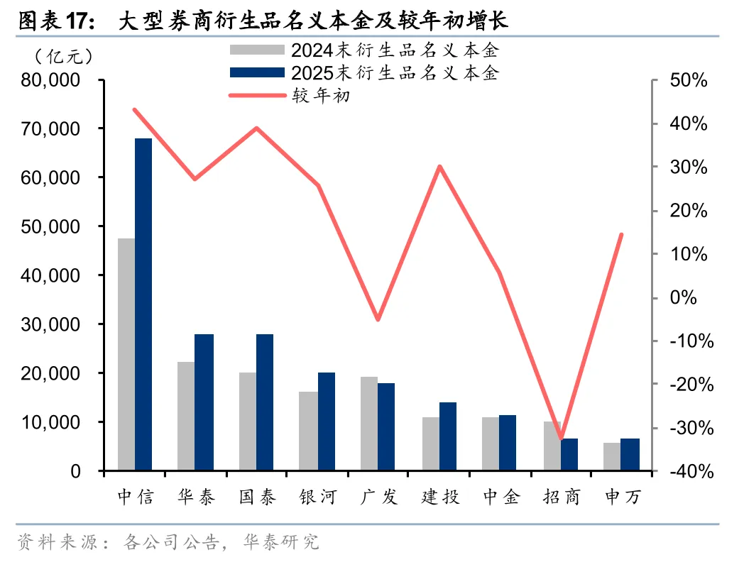 衍生品业务规范发展,权益类名义本金较年初增长。2025年末大券商衍生品名义本金合计较年初+24%,其中权益类衍生品名义本金合计较年初+20%,部分券商实现20%以上增幅。中信、中金、国泰权益衍生品名义本金分别为6977亿元、3755亿元、3256亿元,较年初+29%、+39%、+38%,位列行业前三。