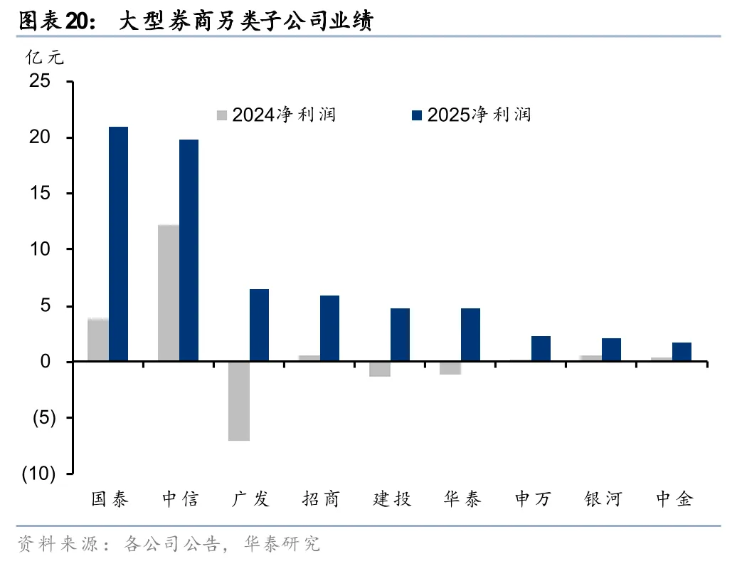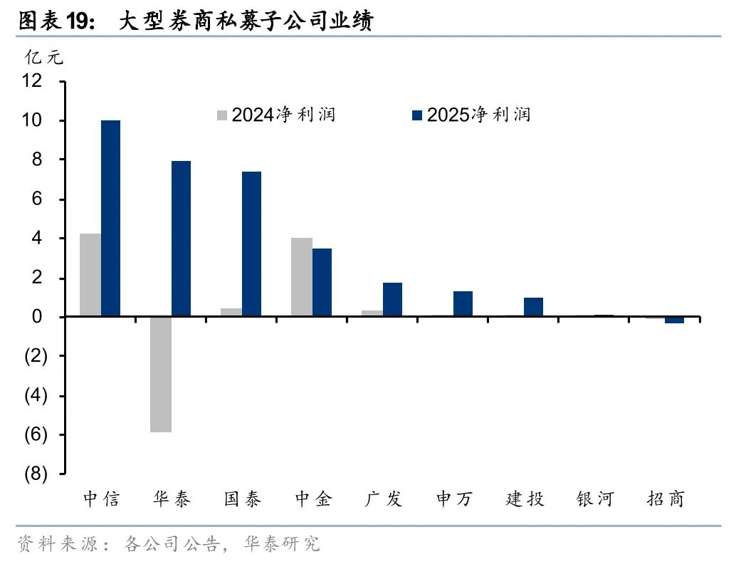 私募股权投资和另类投资业绩同比扭亏。私募股权方面,大券商大部分同比有较大幅度改善(部分券商旗下包含两个私募子公司平台,做合并计算,另类子公司同),2025年中信、华泰、国泰私募子净利润行业领先。另类子公司包括投行跟投业务,2025年显著修复,其中广发由亏损7亿元转为净利润6.5亿元,改善显著。从净利润绝对规模看,国泰、中信分别以20.9亿元、19.9亿元领先。