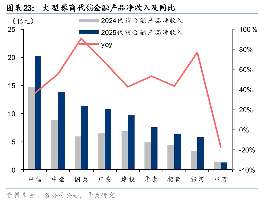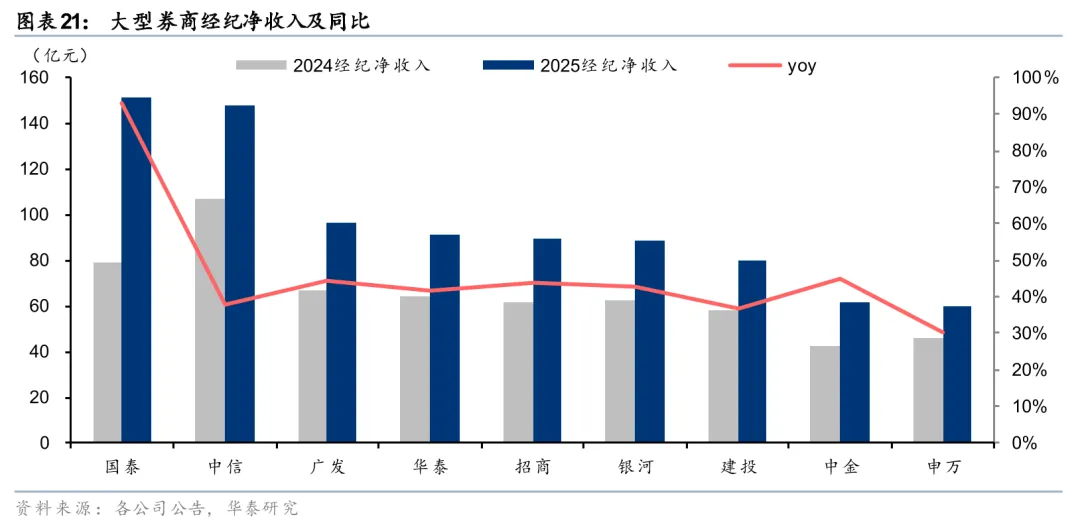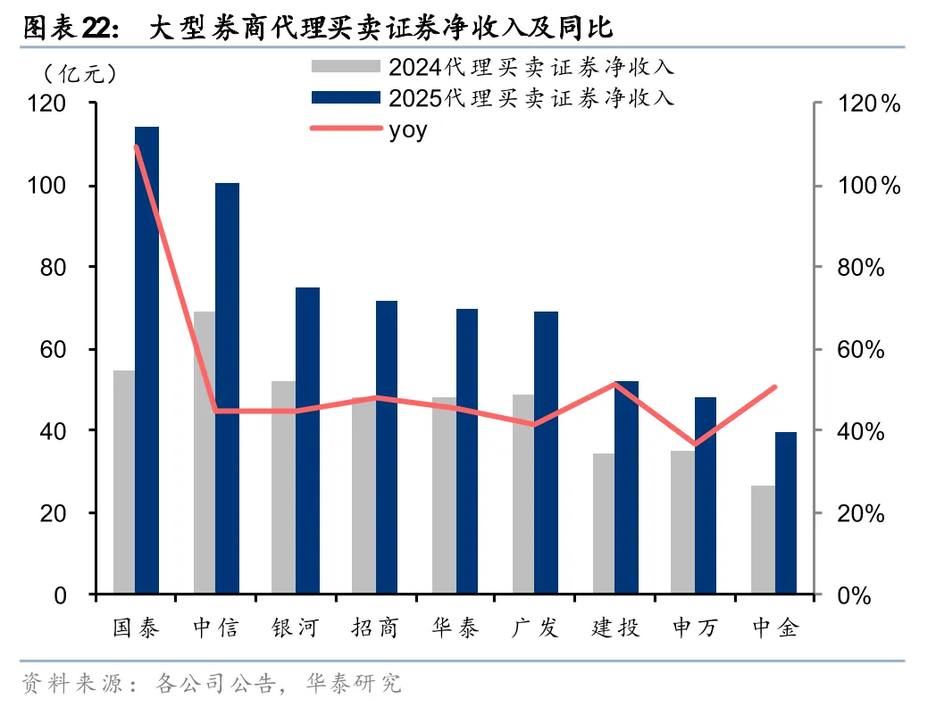 经纪净收入同比高增,代理买卖和代销业务均受益于市场景气度提升。股票市场景气度提升驱动交易放量,2025年全市场日均股基成交额同比+70%,大券商经纪净收入均有同比30%及以上增长,合计同比+47%。其中中金增速最高,同比+45%;广发、招商、银河、华泰也实现同比40%以上增长。细分业务来看,代理买卖净收入合计同比增长54%,代销净收入合计同比增长52%,共同驱动经纪净收入提升。