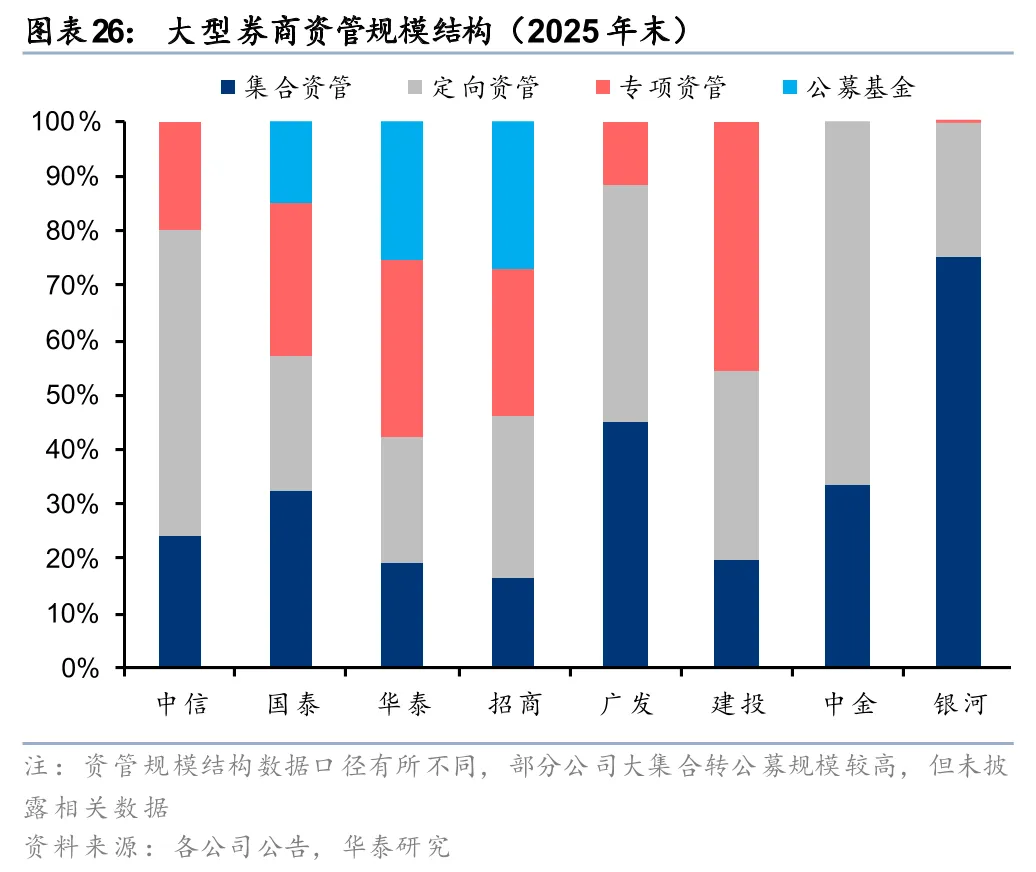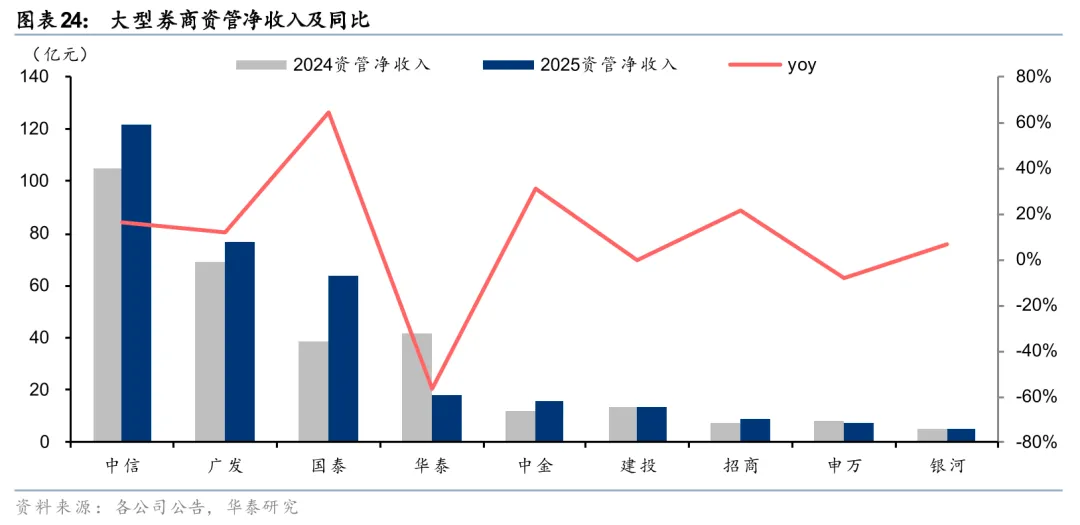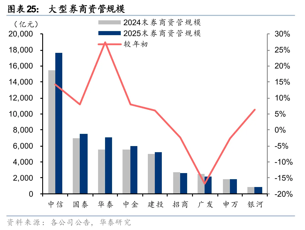 大型券商资管规模增长分化,净收入保持稳健增长。从券商资管的绝对规模看,中信2025年末AUM突破1.7万亿元,大幅领先同业,且较年初提升14%,保持较快增长。同时华泰券商资管AUM较年初+27%,增幅也较大。广发、申万、招商AUM则有所下滑。从资管净收入看,各家券商整体稳健增长,仅申万小幅下滑(华泰波动较大主要系出售AssetMark导致并表收入下滑),9家大券商合计资管净收入同比+10%。