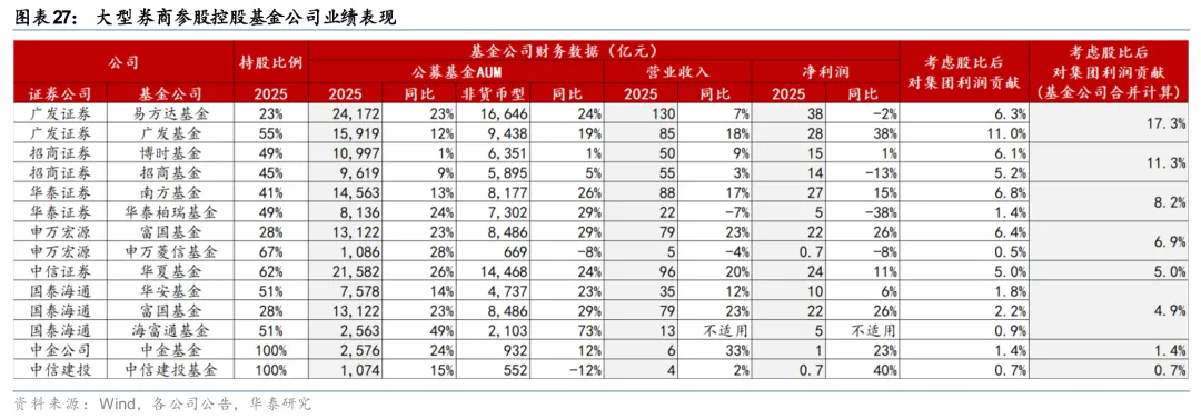 控股/参股基金公司AUM提升,广发、招商净利润贡献持续领先。2025年末公募基金行业总规模较年初进一步增长,券商控股/参股基金公司的AUM也普遍增长。但在费率下行、产品结构调整等因素影响下,券商控股/参股基金公司的财务表现分化。从业绩贡献看,广发、招商旗下控股参股基金贡献最高,2025年净利润贡献率分别达17.3%、11.3%。
