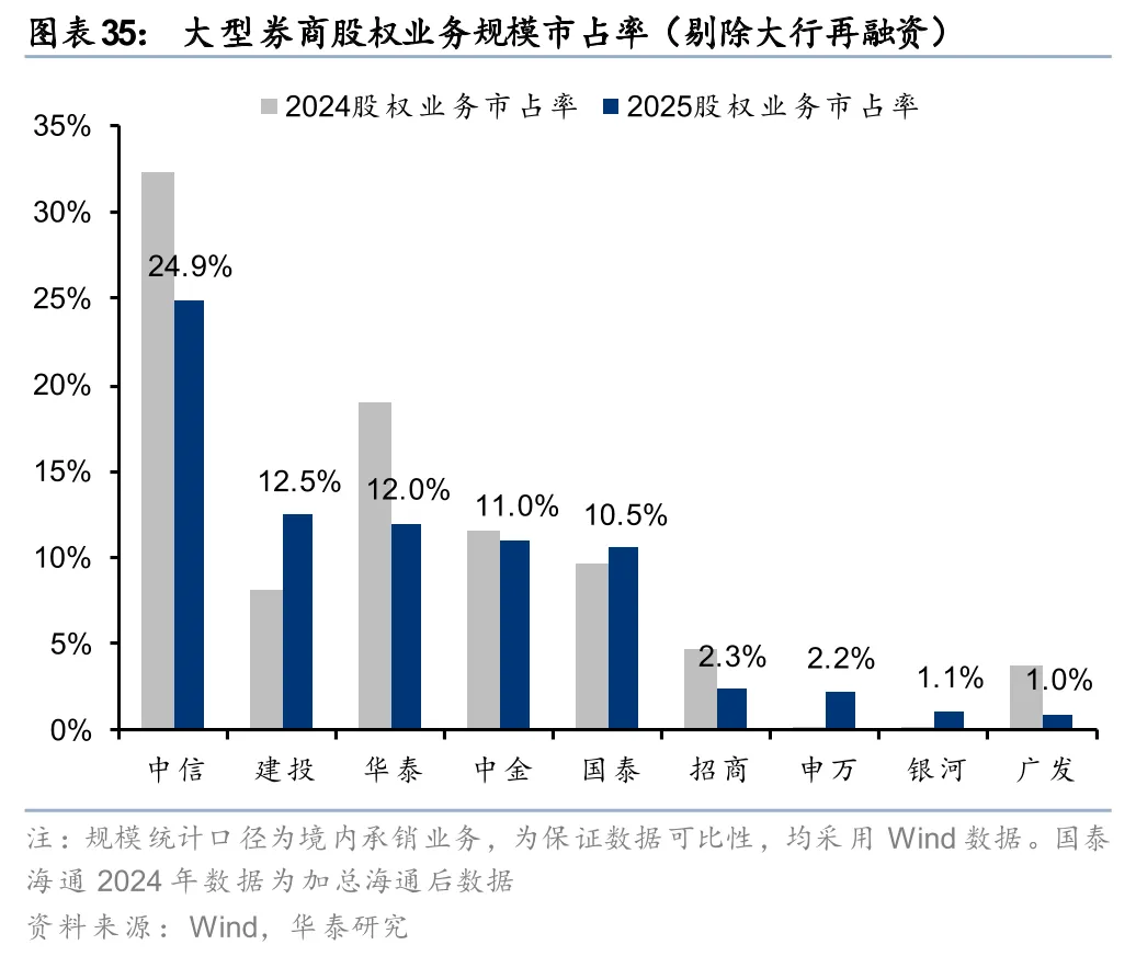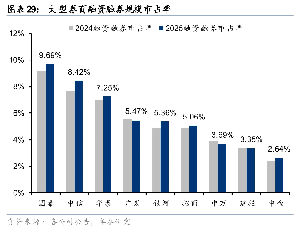 大券商两融余额大幅增长,国泰海通市占率跃居第一。2025年末大券商融资融券余额较年初均有增长,且增速均在30%及以上。中金、中信增长较快,环比+50%、+50%。从绝对规模看,国泰海通跃居行业第1,中信排名第2,分别为2462亿元和2139亿元,市占率9.69%和8.42%。