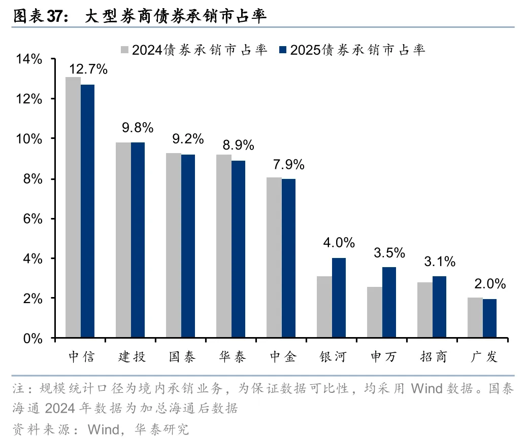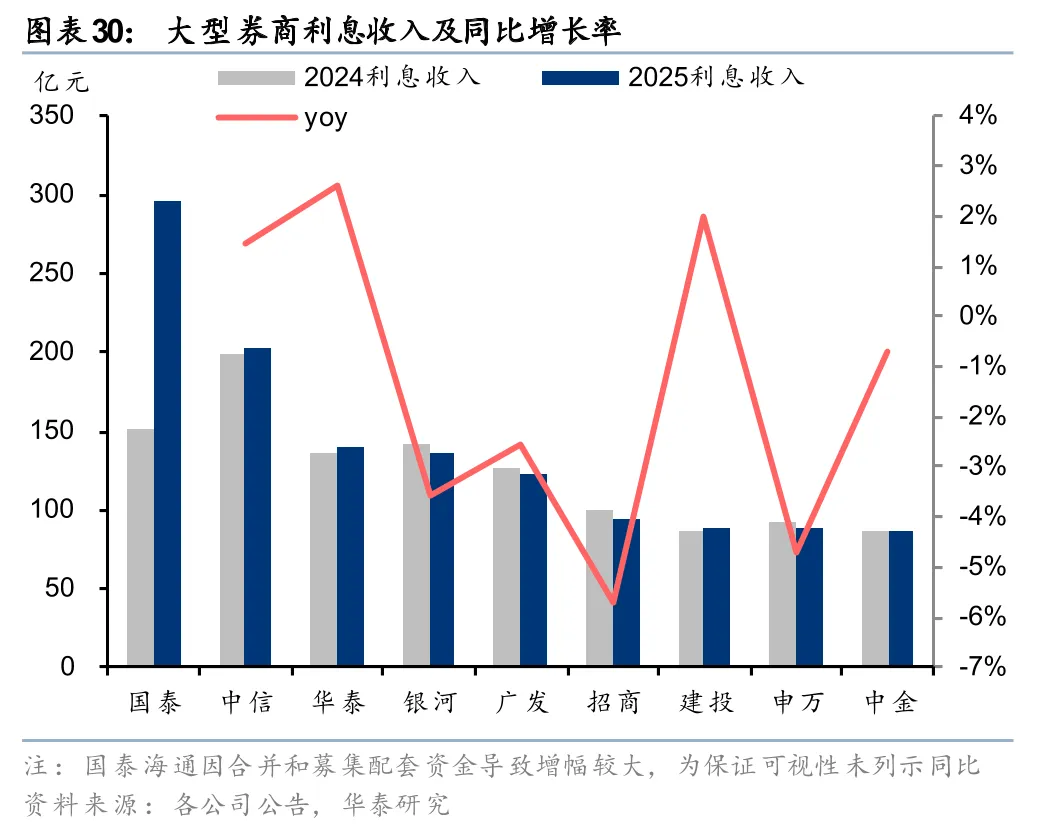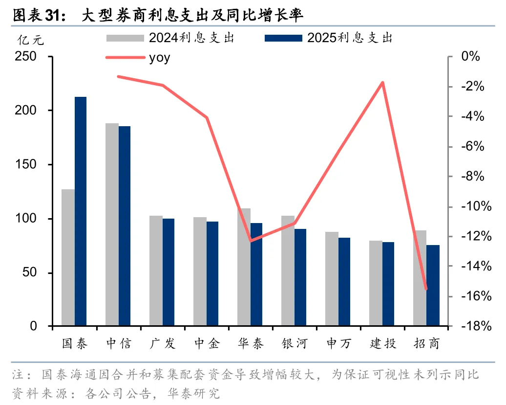 利息收入不增反降,但低利率环境下利息支出降幅更大,驱动净收入增长。2025年大型券商利息收入普遍小幅下滑,仅中信、华泰、建投实现小幅正增长,主要是货币资金及结算备付金等利息收入下滑幅度大于两融利息收入增幅,导致利息收入不增反降。大型券商利息净收入普遍增长,主要是利息支出下行幅度大于利息收入。2025年大券商利息支出均有下滑,招商、华泰、银河分别同比-16%、-12%、-11%,下滑较多,主要是有息负债利息支出下降。