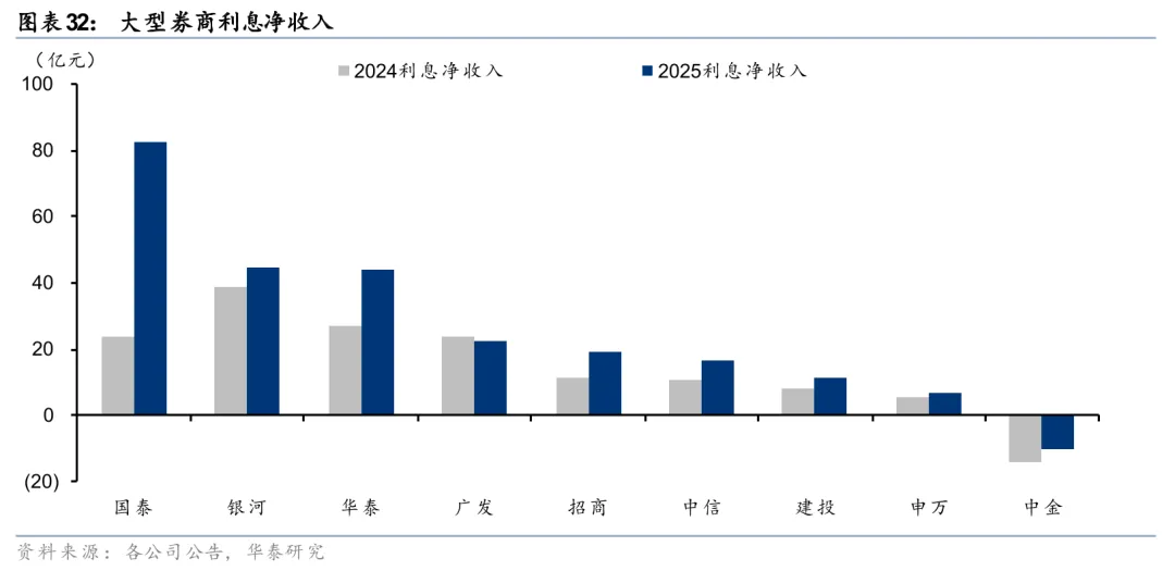 股市景气度提升驱动交易放量,2025年全市场日均股基成交额同比+70%。大券商经纪净收入均有同比30%及以上增长。细分业务来看,代理买卖、代销净收入合计同比+54%、+52%,共同驱动收入提升。杠杆资金活跃,年末大券商两融余额较年初增长均在30%及以上。国泰海通规模跃居行业第1,中信排名第2,分别为2462亿元和2139亿元,市占率9.69%和8.42%。货币资金及结算备付金等利息收入下滑幅度大于两融利息收入增幅,导致利息收入不增反降,但低利率环境下利息支出降幅更大,驱动净收入普遍增长。