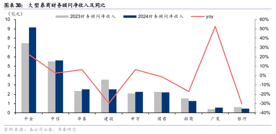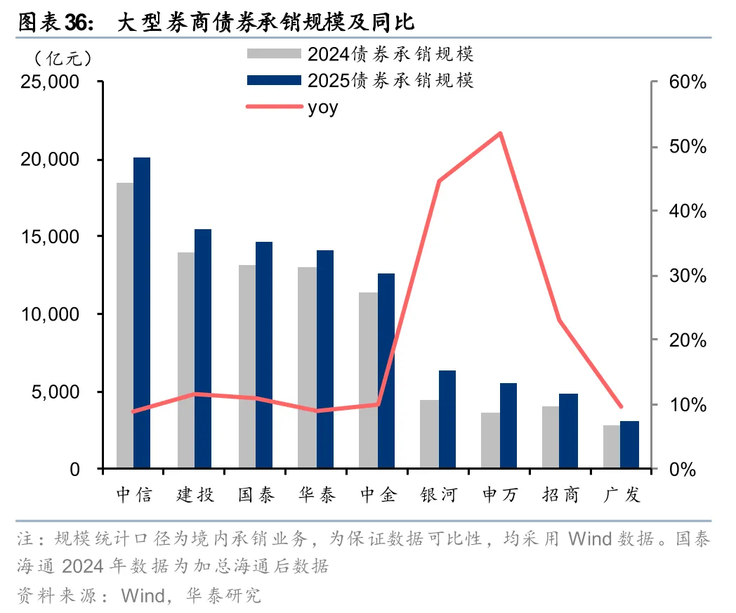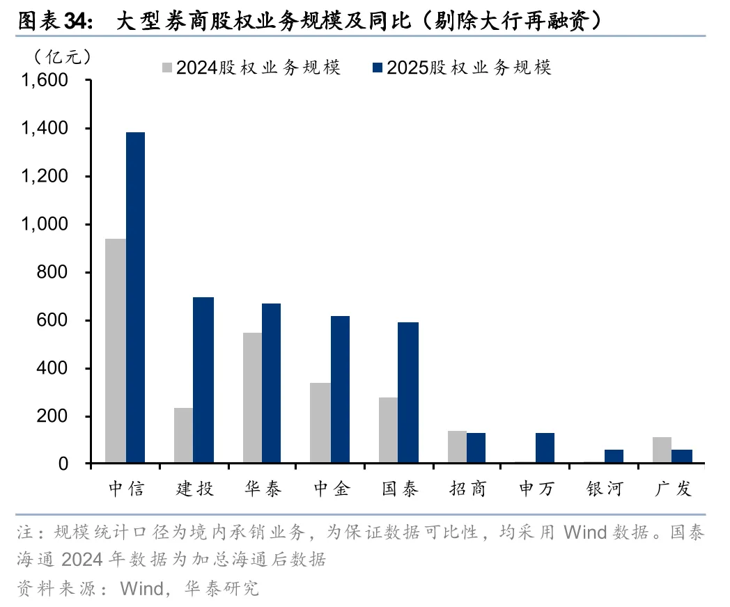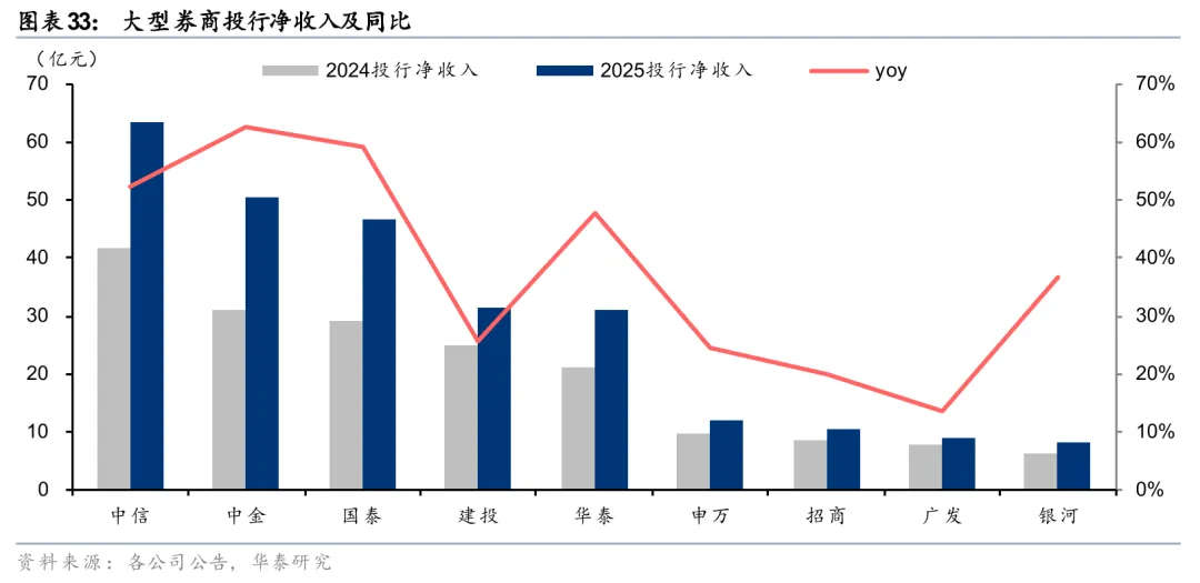 股权融资承销提量,投行净收入同比增长。2025年大型券商投行净收入均实现同比两位数增长,部分增速超50%,合计同比+46%。从业务规模看,大券商股权、债券承销业务规模均实现同比增长,其中股权承销规模(剔除大行再融资数据)同比增长66%、债券承销规模同比增长14%。从排名来看,中信、建投、华泰位列境内股权融资承销额前三,中信、建投、国泰位列境内债券承销额前三,行业格局保持稳定。从财务顾问业务净收入看,2025年大券商合计同比增长28%,其中中金、中信分别以9.2亿元、5.6亿元领跑行业。
