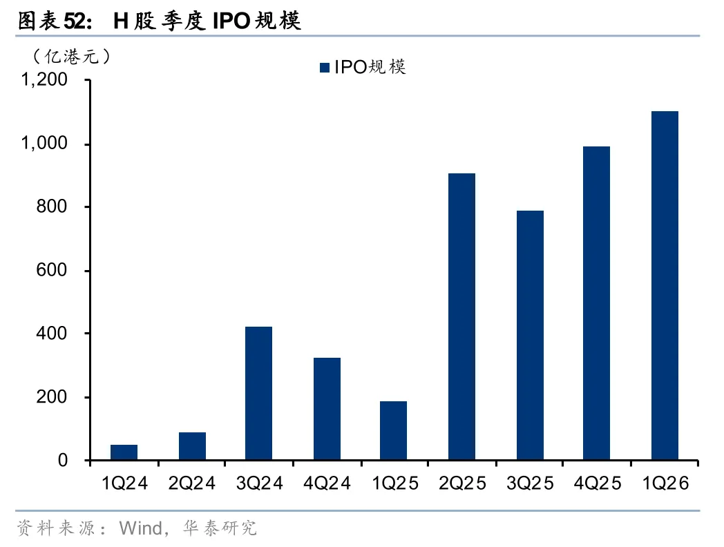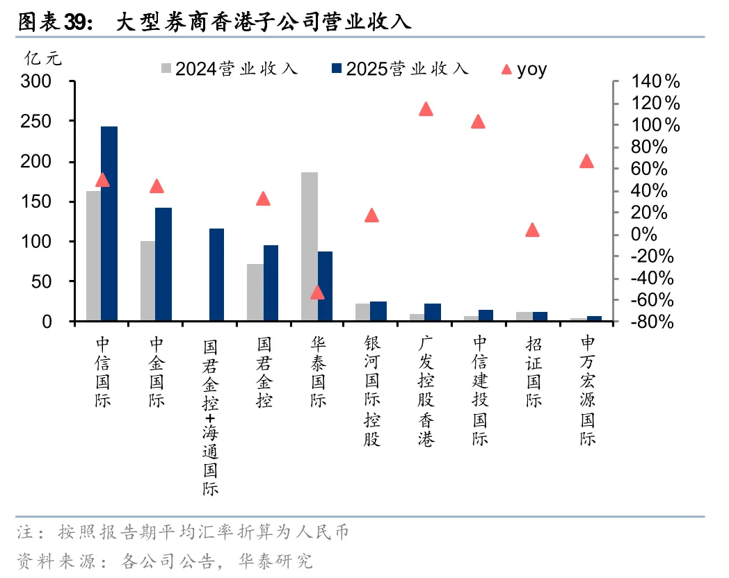 国际业务受益于香港资本市场制度优势和规模提升,头部券商加码延续。中资券商多通过设立香港子公司开展国际业务,香港市场拥有独特的制度优势,如IPO审核条件更包容、配售可采用“先旧后新”机制提高再融资效率、采取与国际发达市场相同的T+0交易机制等。且近年来,香港资本市场制度优势仍在不断加强,如2024年引入库存股机制,2025年推出“科企专线”,允许以保密形式递表等。在此背景下,港股市场成为优质资产上市的首选市场之一,2025年全年IPO、再融资规模分别为2,869亿港元、3,264亿港元,同比增速超200%;26Q1延续高景气,IPO规模同比+489%。同时,中资券商补充香港子公司资本实力,加强国际业务布局。2025年以来建投、招商、华泰、广发先后公告拟向香港子公司增资,其中建投已于2026年2月完成15亿港元增资。