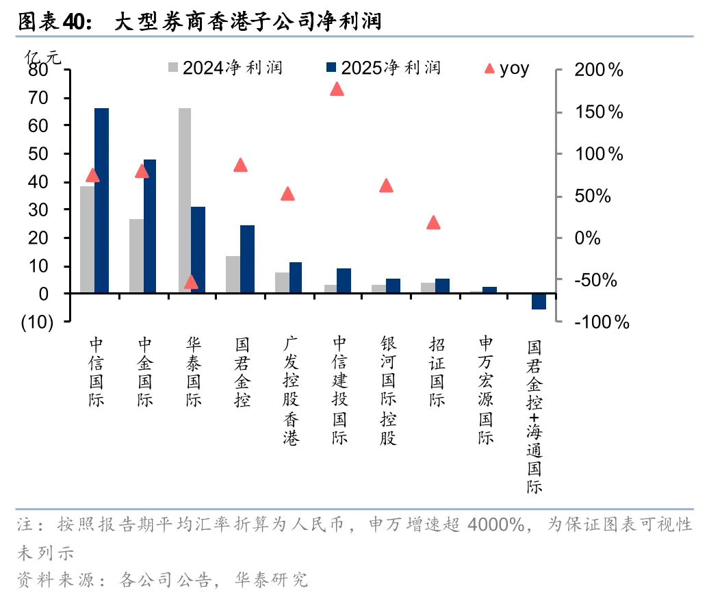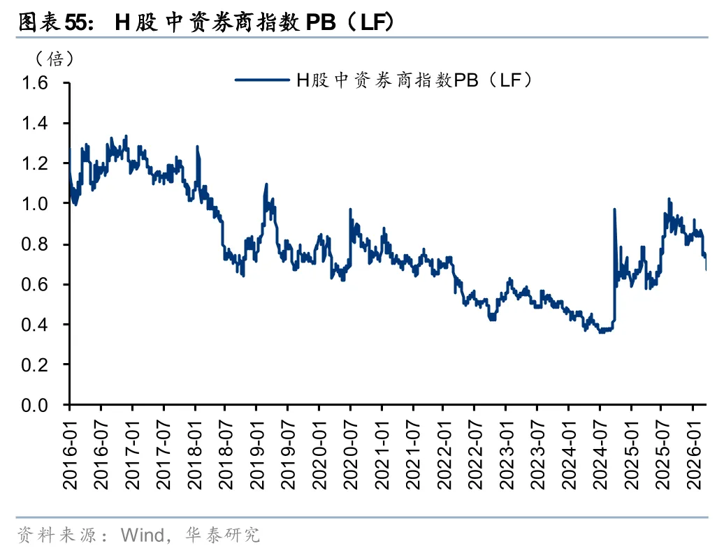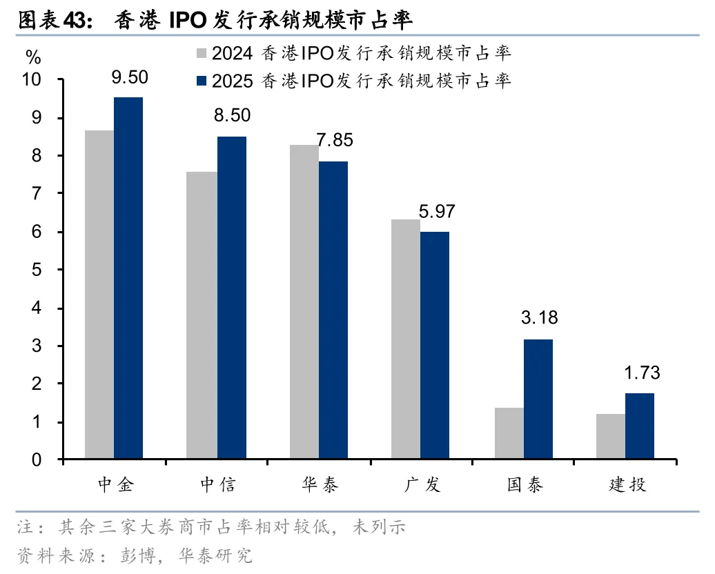 5)国际化扩张提速,境外子公司增资频繁。2025年中信国际/中金国际/华泰国际净利润折合人民币约66.5/47.6/30.7亿元,位居行业前列。国君金控净利润折合人民币约24.6亿元,排名第四,但受海通国际拖累,国泰海通整体国际业务亏损。中资券商在港股投行业务的竞争力进一步提升,6家排名靠前的中资券商(中金、中信、华泰、广发、国泰海通、建投)香港IPO发行承销规模市占率合计达36.73%,同比提升3.33个百分点。国际业务快速发展的同时,大券商对境外子公司增资频繁,2025年以来建投、招商、华泰、广发先后公告拟向香港子公司增资,其中建投已于2026年2月完成15亿港元增资。