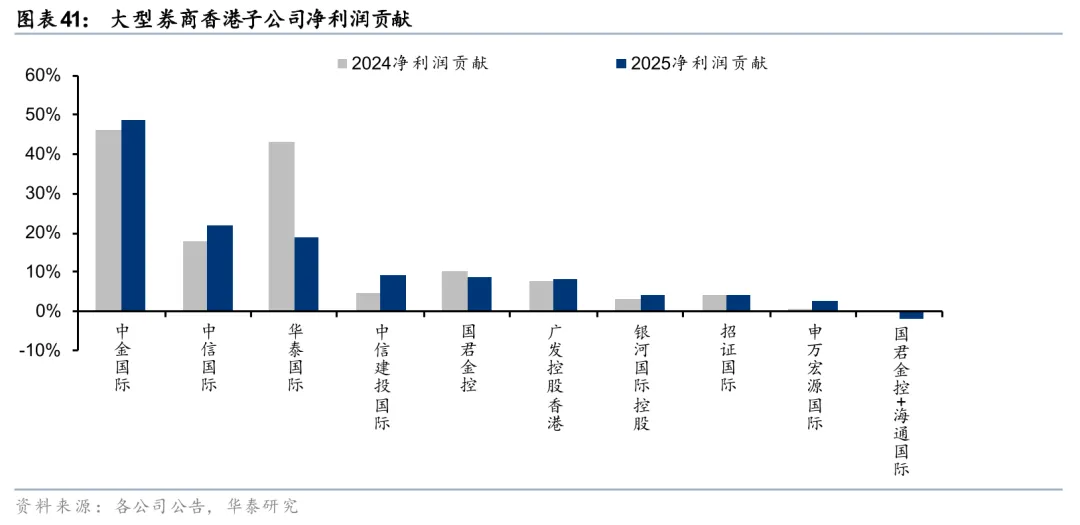 香港子公司净利润贡献度普遍增长,大型券商增资频繁。从香港子公司净利润规模看,2025年中信国际/中金国际/华泰国际净利润折合人民币约66.5/47.6/30.7亿元,位居行业前列。国君金控净利润折合人民币约24.6亿元,排名第四,但受海通国际拖累,国泰海通整体国际业务亏损。从净利润贡献看,大券商香港子公司对集团的业绩贡献显著提升,中金国际/中信国际净利润贡献分别为49%/22%,同比提升2.2个百分点、4.5个百分点,处于较高水平。国际业务快速发展的同时,大券商对境外子公司增资频繁,2025年以来建投、招商、华泰、广发先后公告拟向香港子公司增资,其中建投已于2026年2月完成15亿港元增资。