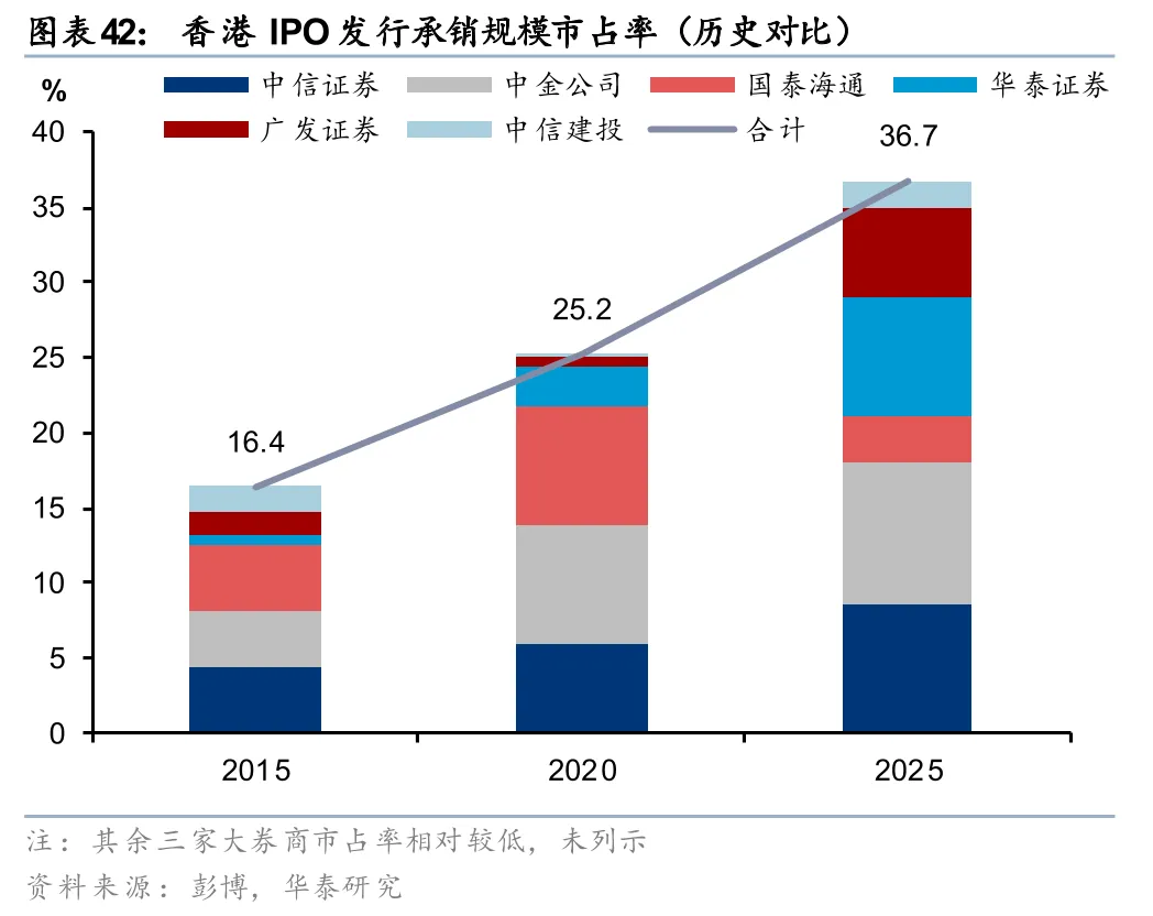 中资券商在港股投行业务的竞争力进一步提升。根据彭博数据统计,6家排名靠前的中资券商(中金、中信、华泰、广发、国泰海通、建投),香港IPO发行承销规模市占率合计达36.73%,同比提升3.33个百分点,更是较2015年的16.39%、2020年的25.20%大幅增长。