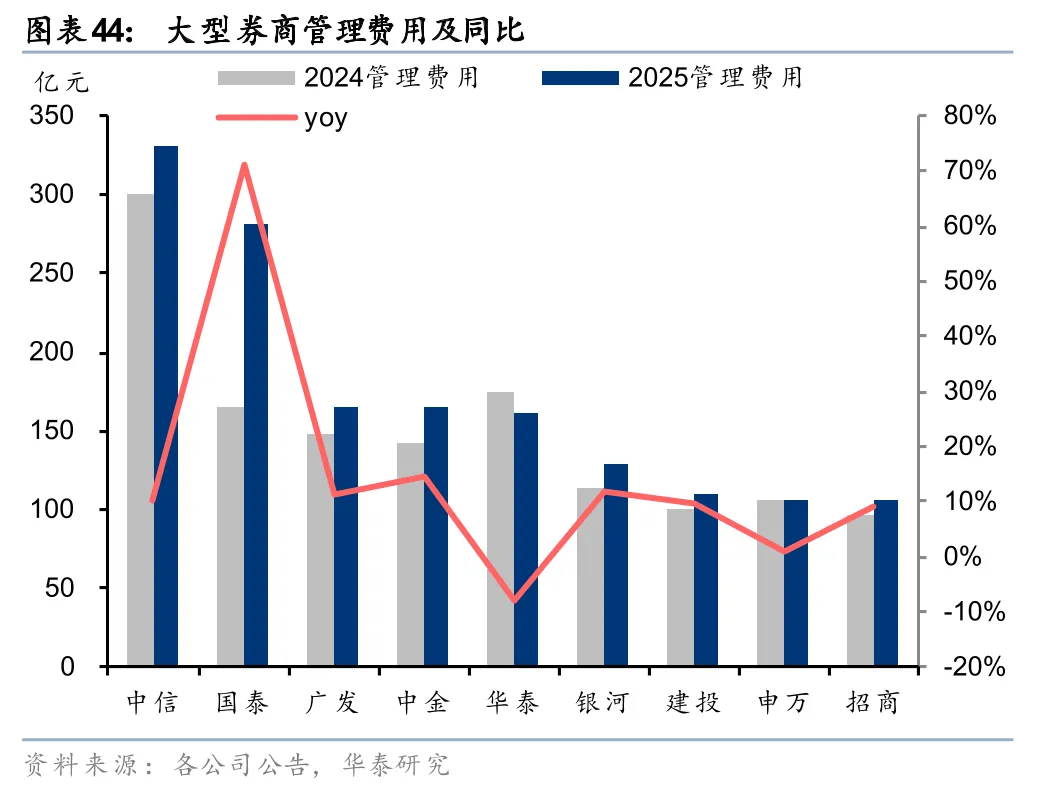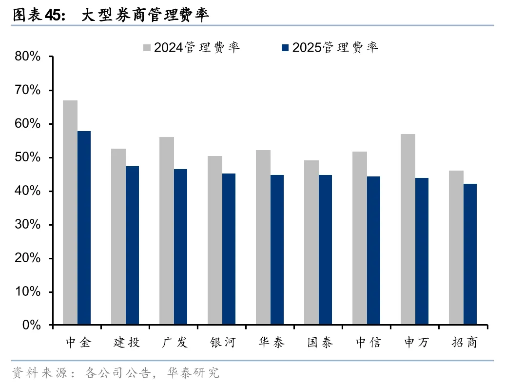 管理费用随营业收入同比普遍增长,费率延续下降趋势。2025年大型券商管理费用普遍随营业收入提升,仅华泰有所下滑。但管理费率延续下滑趋势,9家大型券商管理费率均同比下降,申万、广发、中金同比分别下滑13个百分点、10个百分点、9个百分点,降幅靠前。